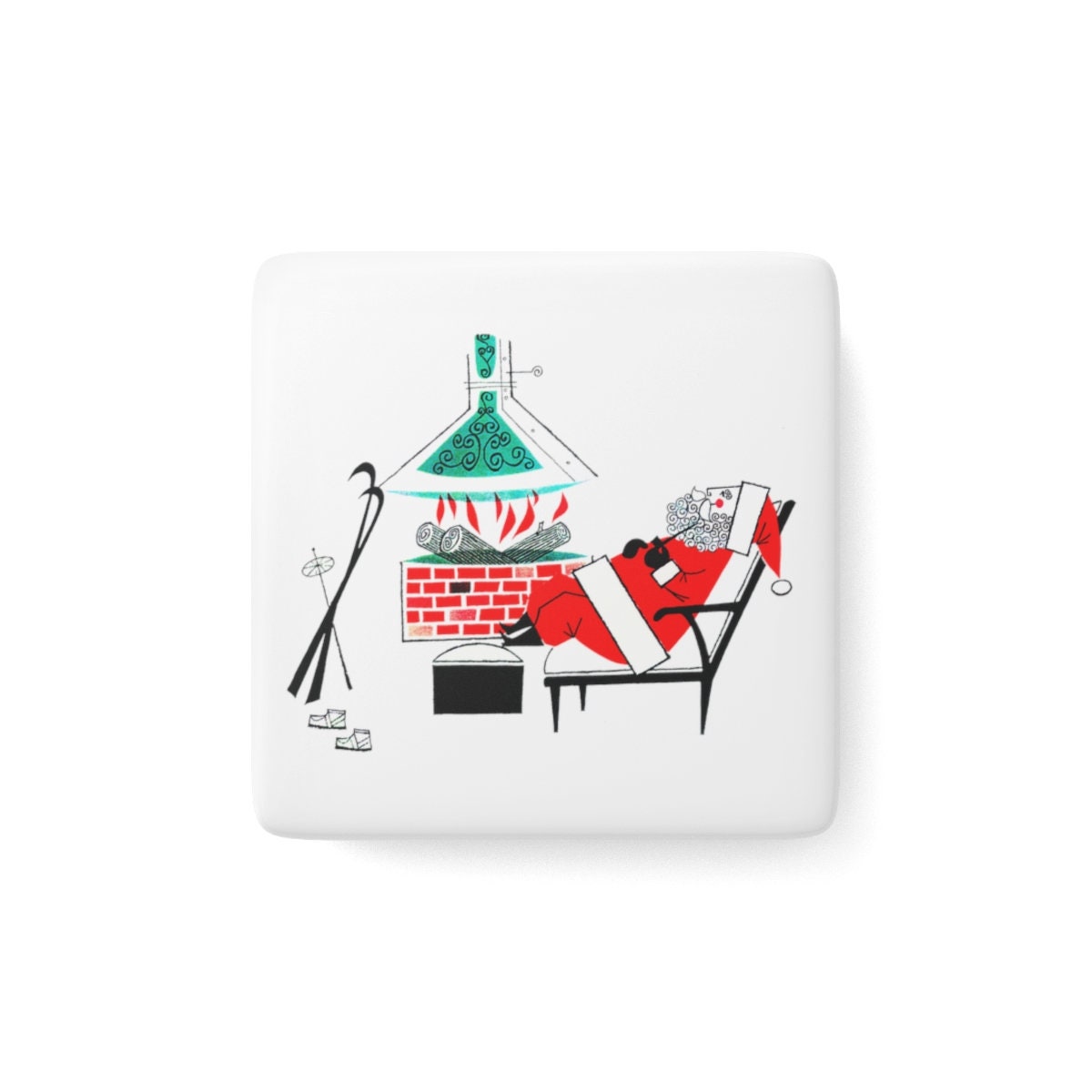 Retro MCM Santa at a Ski Lodge Porcelain Magnet, Square / Mid Century Modern 1950's Christmas Cheer for the Fridge!
