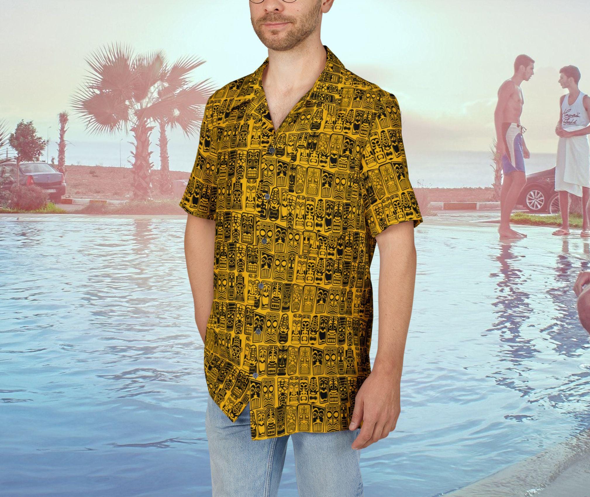Retro Tiki Tropical Yellow and Black Men's Hawaiian Shirt with a mid-century modern tropical design, perfect for Tiki parties or a MCM lifestyle. This shirt exudes a fun and vibrant atmosphere, fitting seamlessly into casual settings or beach outings. Ideal for men looking to add a touch of retro flair to their wardrobe