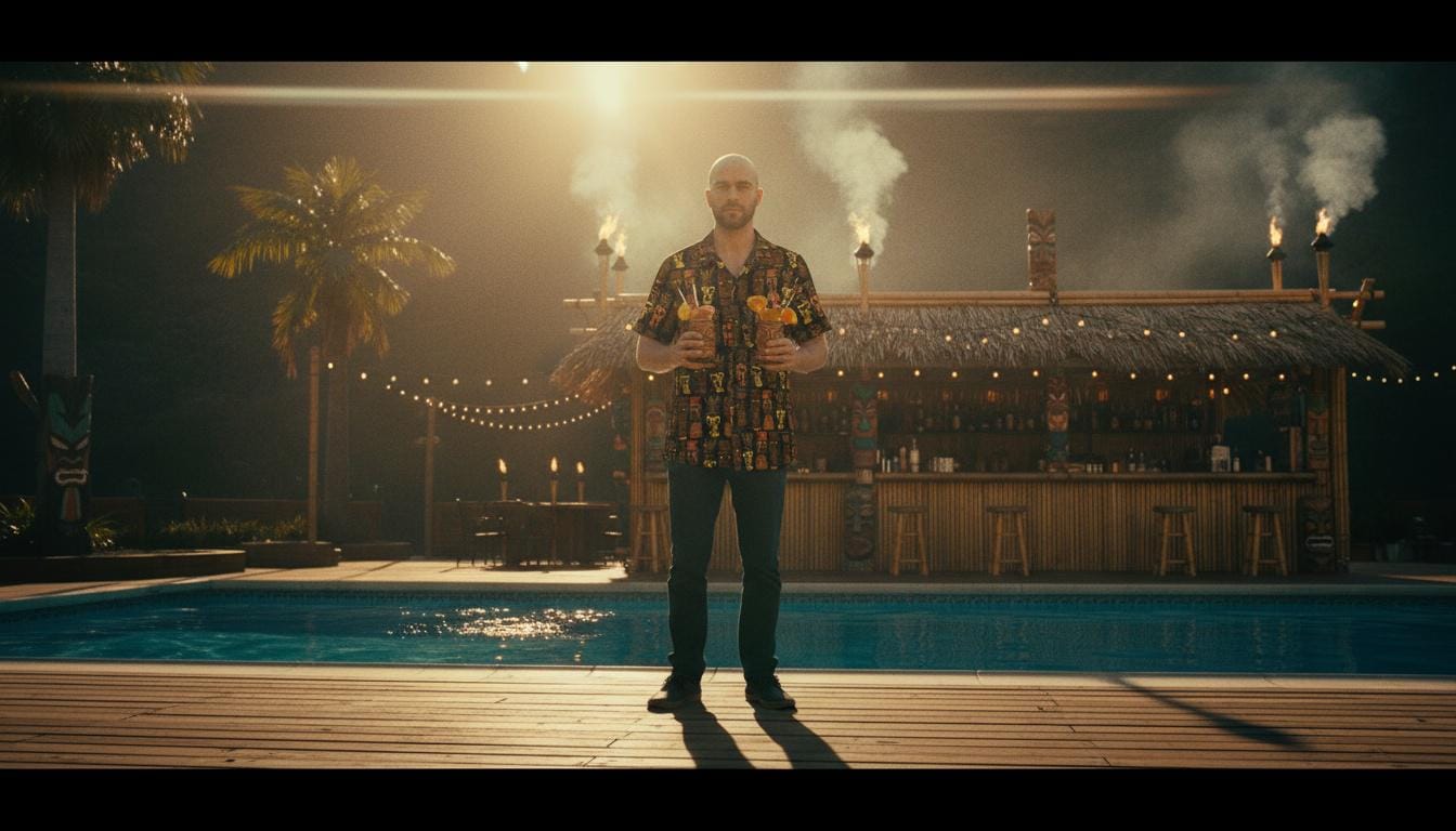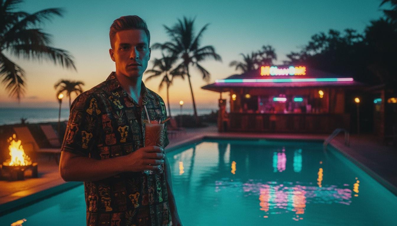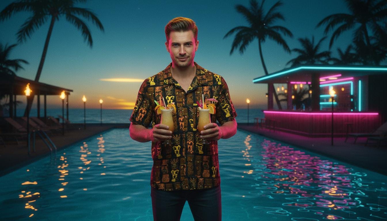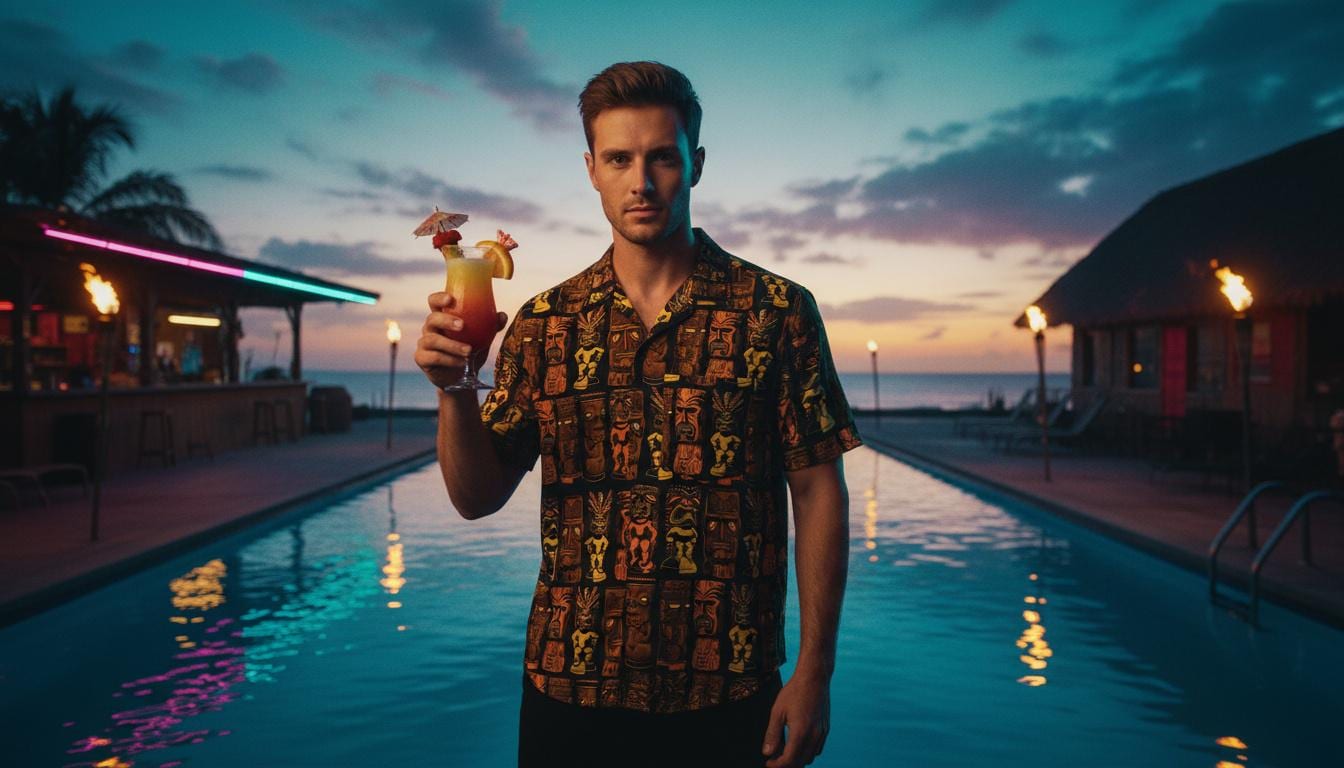 Retro Tiki Gods on Volcano Orange Men's Hawaiian Shirt with a Mid Century Modern Tropical vibe, perfect for Tiki parties or MCM enthusiasts. Great for adding a fun and festive touch to summer gatherings and beach outings.