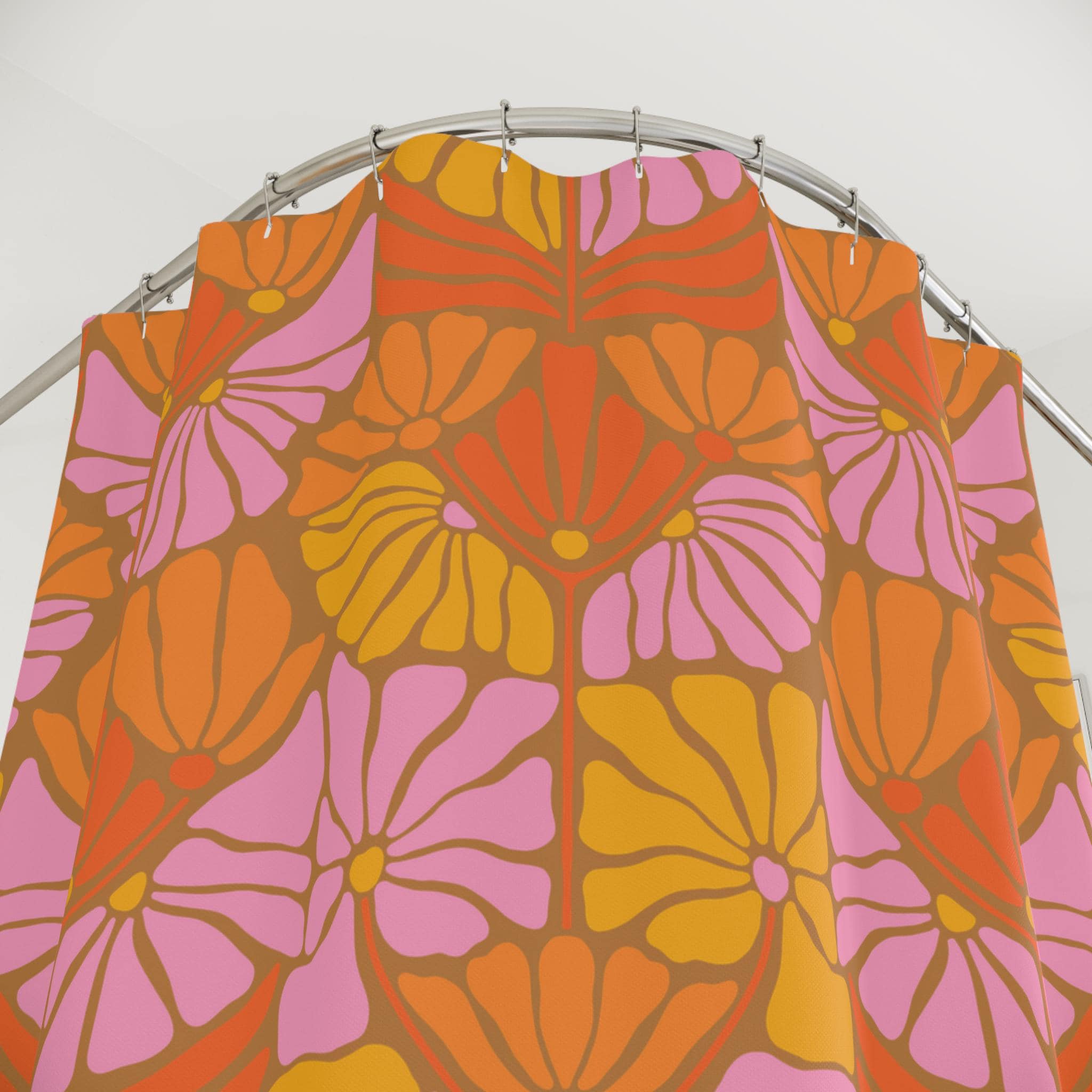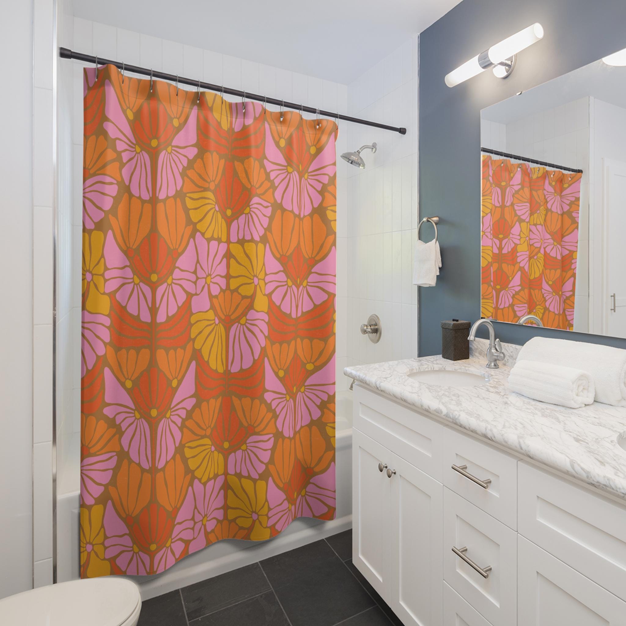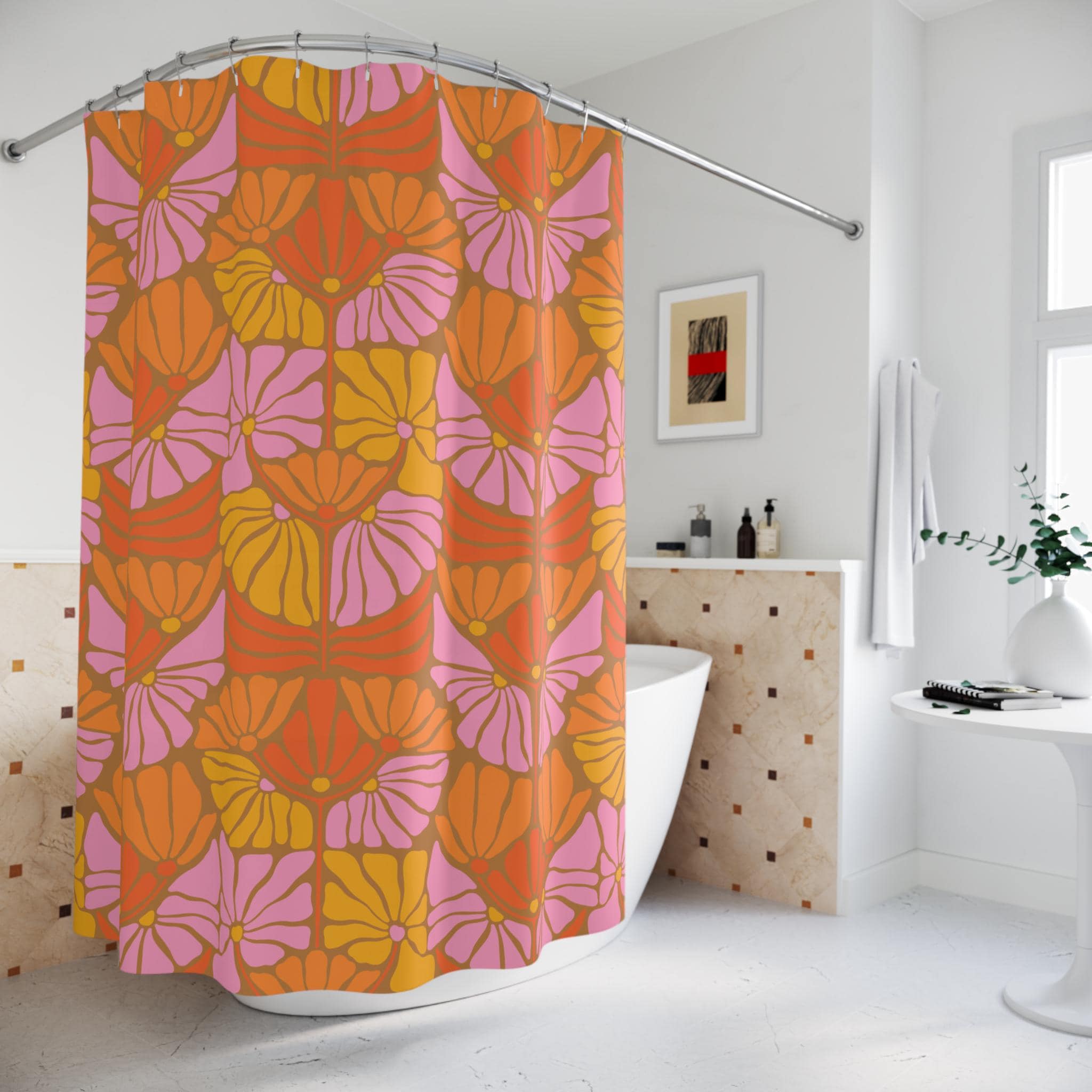 Bring a retro 70s vibe to your bathroom with this orange, pink, and brown shower curtain. Made of 100% polyester, this durable curtain features 12 buttonholes for easy hanging. Perfect for adults looking to add a fun pop of color to their bath decor. Ideal for adding a nostalgic touch to your bathroom during retro-themed parties or events.
