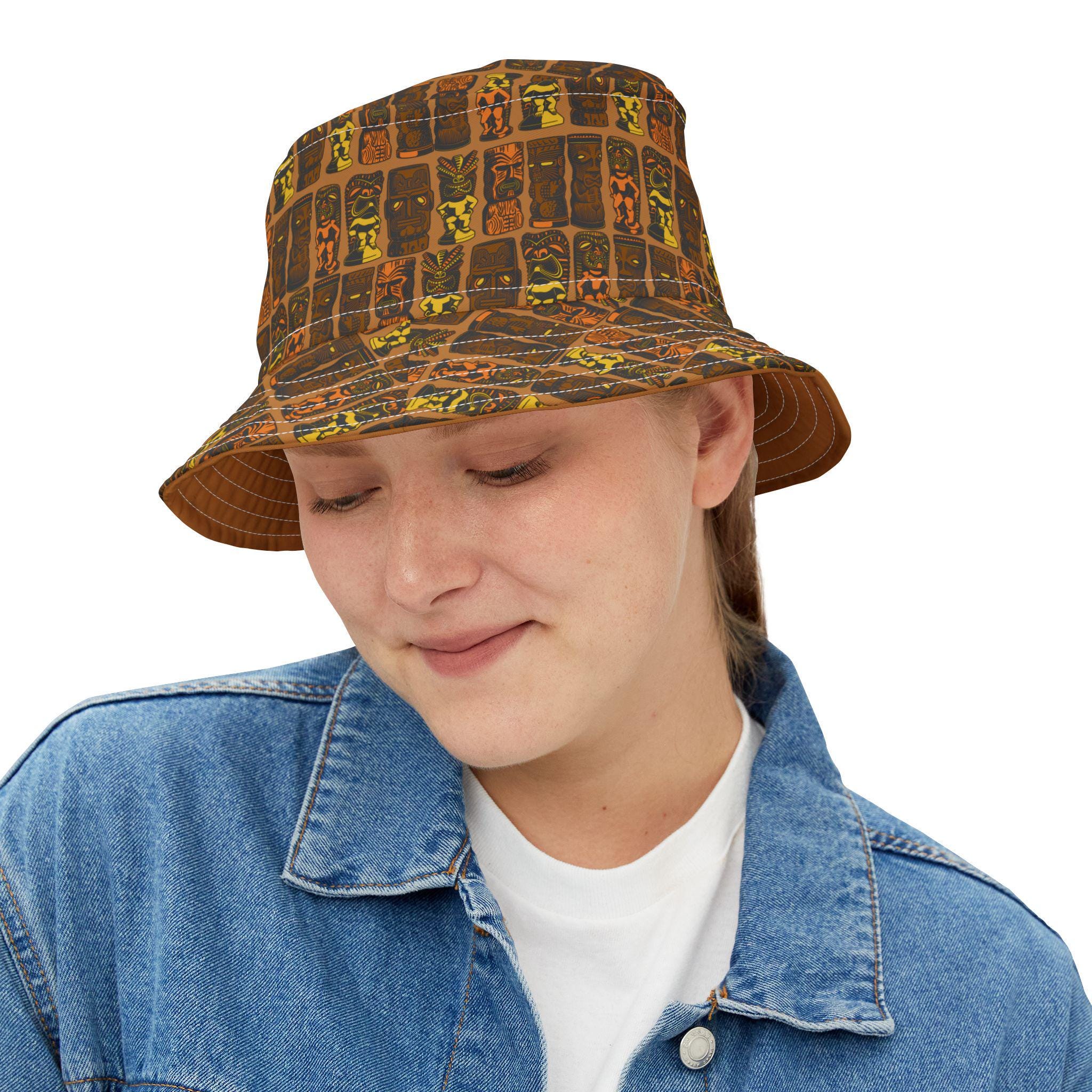 Retro Tiki gods brown Bucket Hat, perfect for a Summer Beach Accessory or Boating Vacation Essential. Ideal for MCM Lover Hat enthusiasts. This hat exudes a nostalgic and tropical vibe, adding a touch of fun to any outfit. Great for those who enjoy outdoor activities or attending festivals.