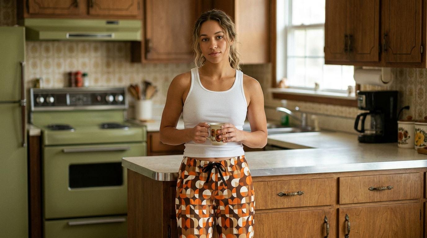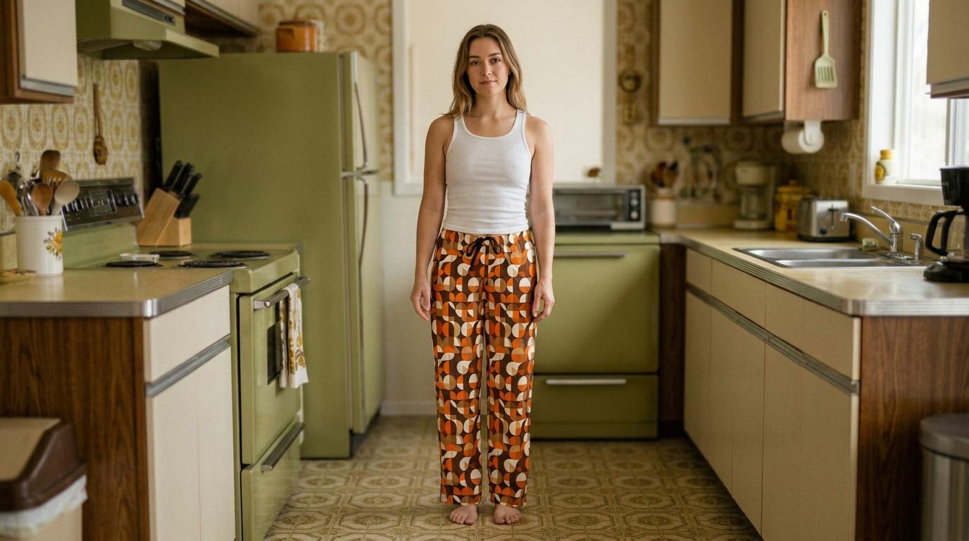 Retro Mod 60s Brown Pattern Pajama Pants, perfect for cozy sleepwear at home, festival lounging, and casual weekend attire. Offers a chill mid-century modern vibe, ideal for women looking for stylish comfort. Relevant for holidays, festivals, and relaxed weekends.