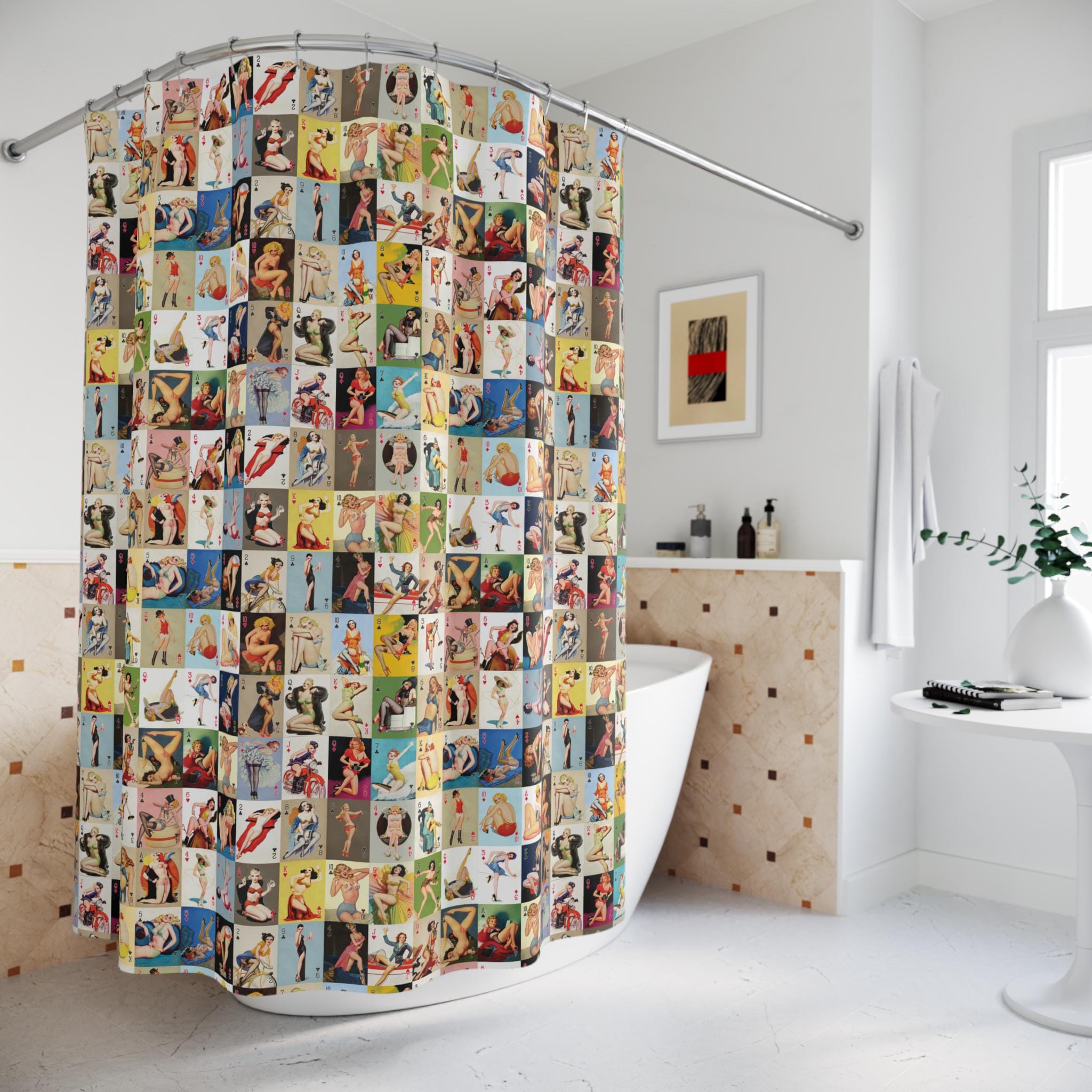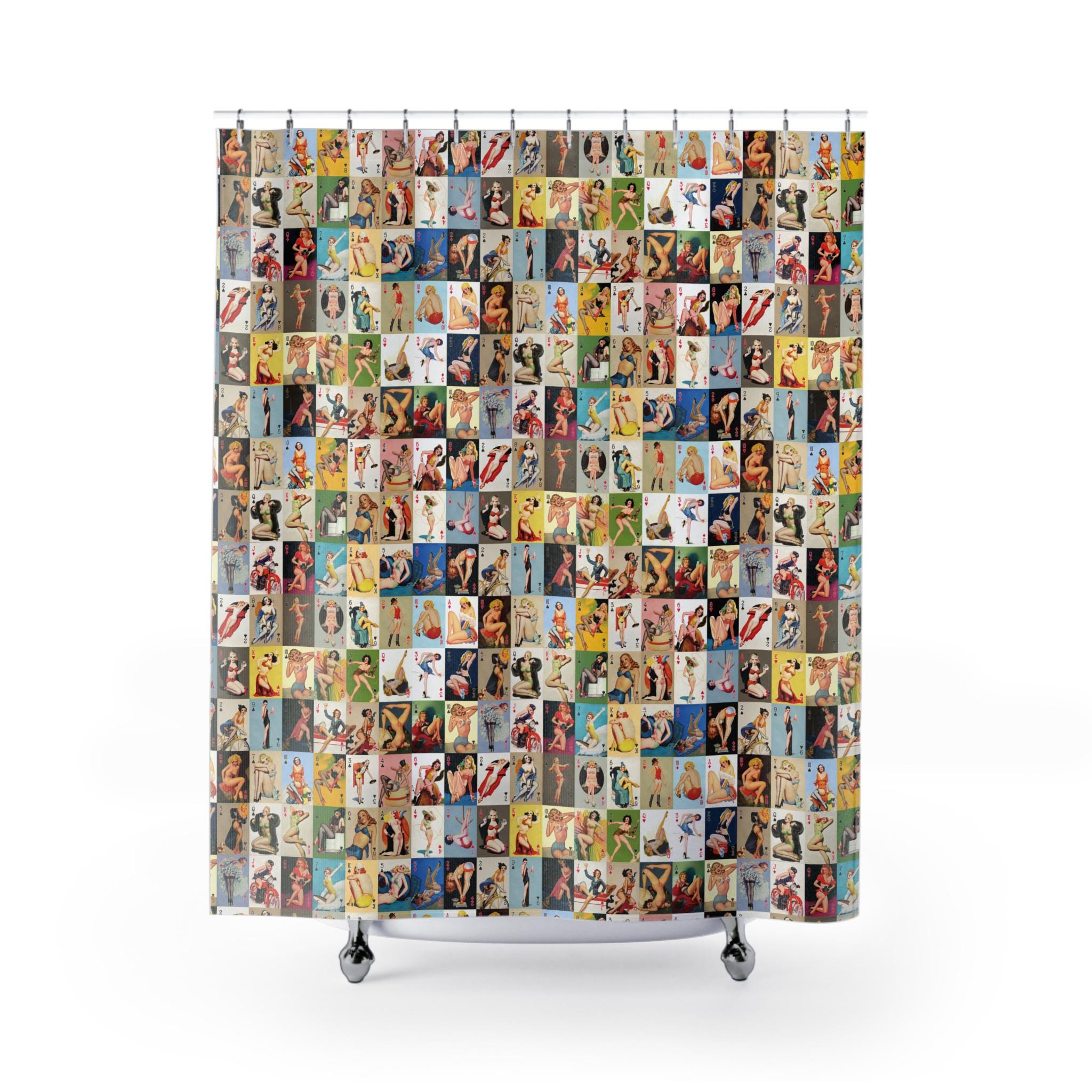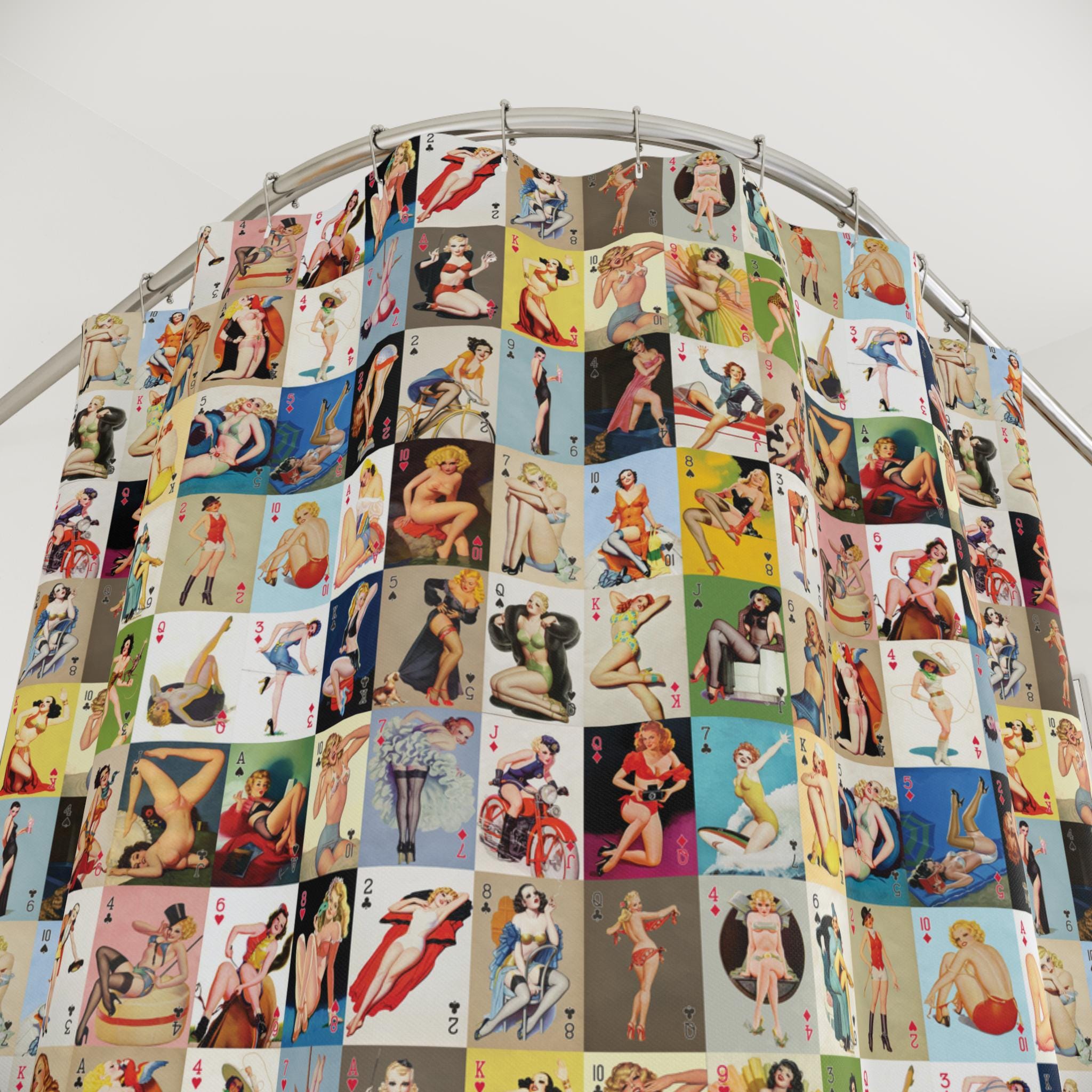 Vintage Pulp PinUp Playing Cards Shower Curtain that adds a touch of retro charm to your bathroom. Perfect for fans of vintage aesthetics and pin-up art. Ideal for those looking to spice up their bathroom decor with a unique and playful design. Great for themed parties, retro events, or as a fun gift for collectors of vintage memorabilia.