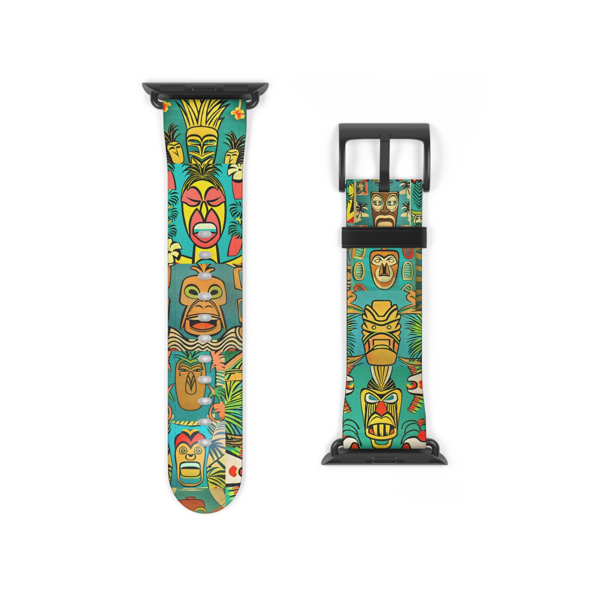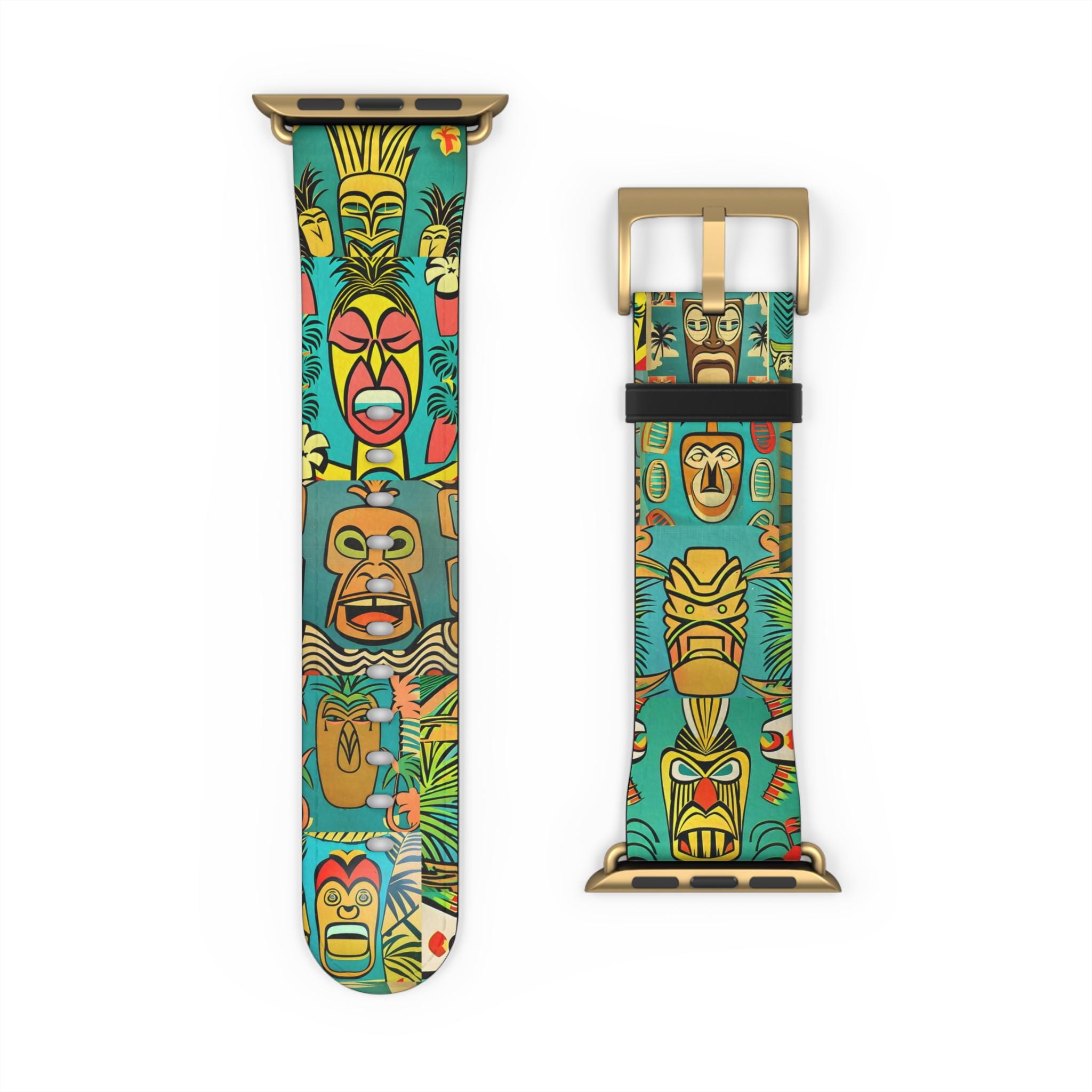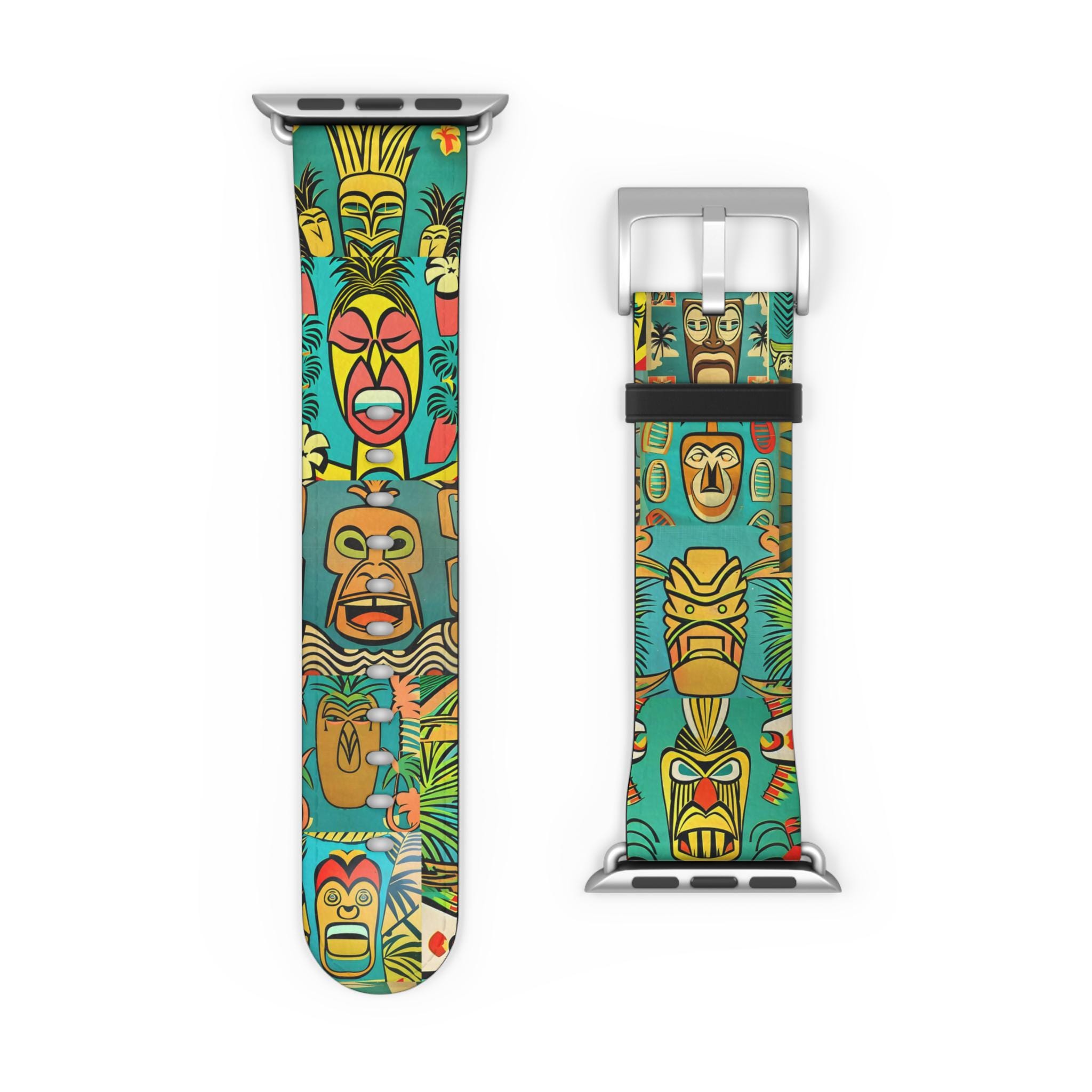 Colorful Tropical MCM Polynesian inspired Watch Band featuring a Tiki Mask pattern. This vibrant strap is perfect for adding a touch of tropical paradise to your Apple Watch. Ideal for adults who love colorful and unique accessories. Perfect for summer, vacations, beach trips, or just adding a pop of color to your everyday wardrobe.