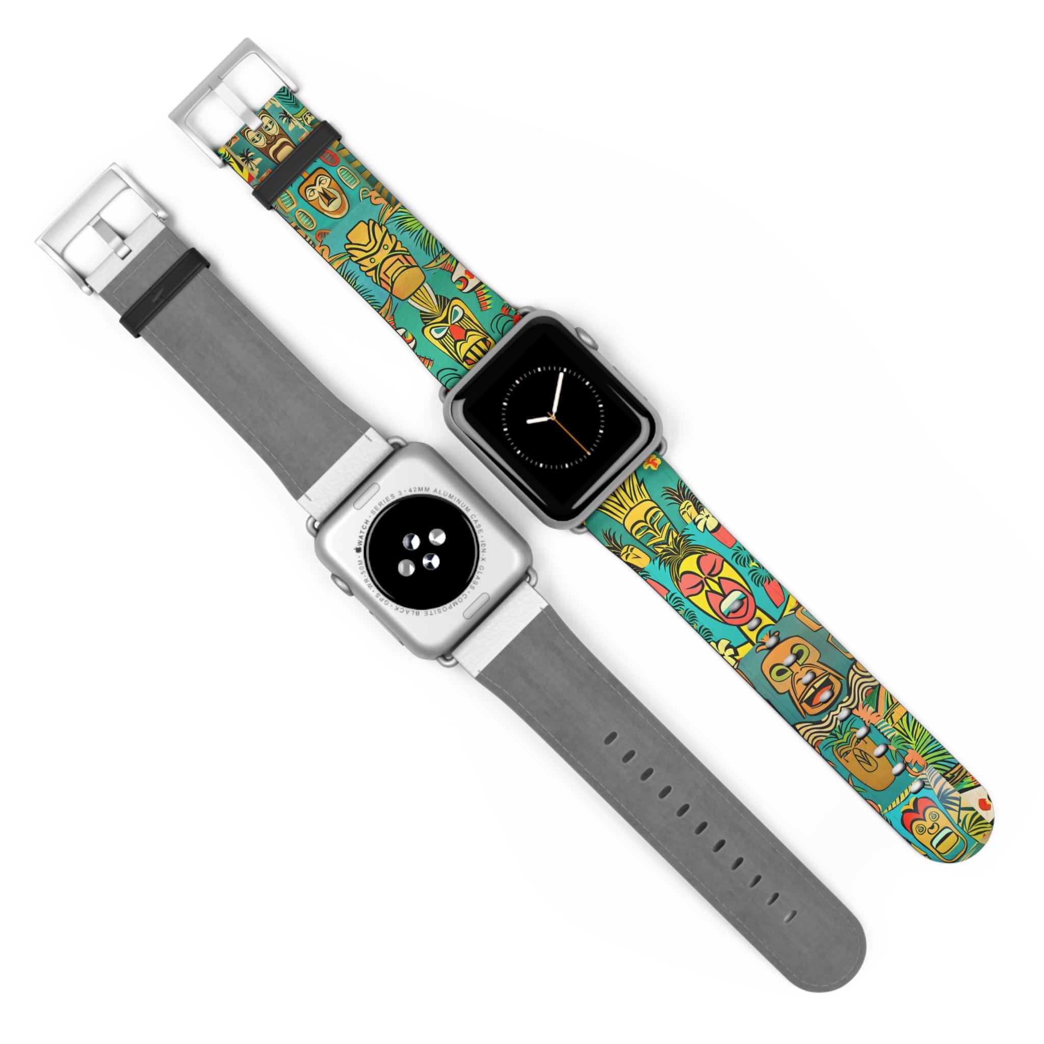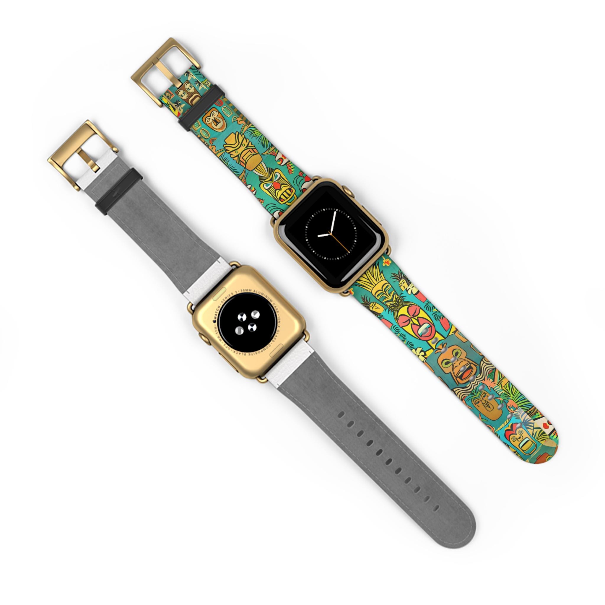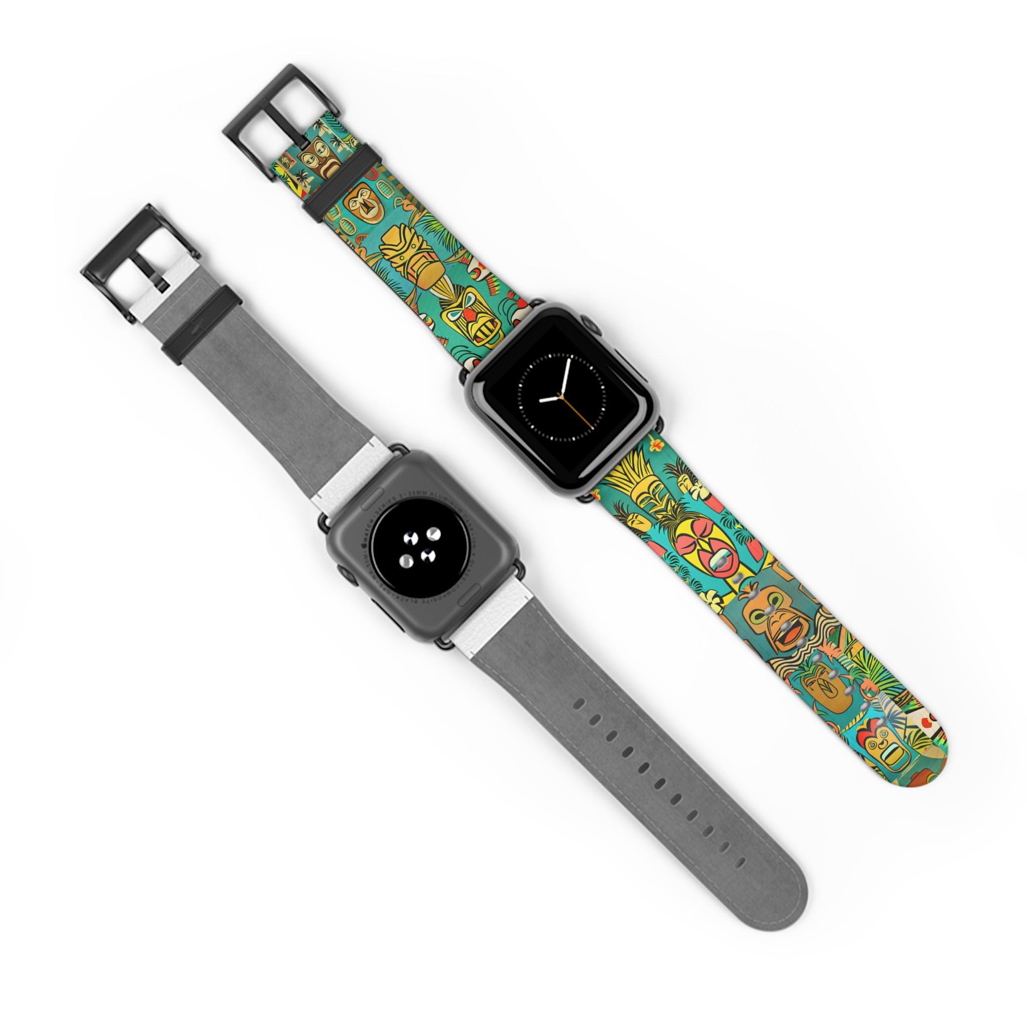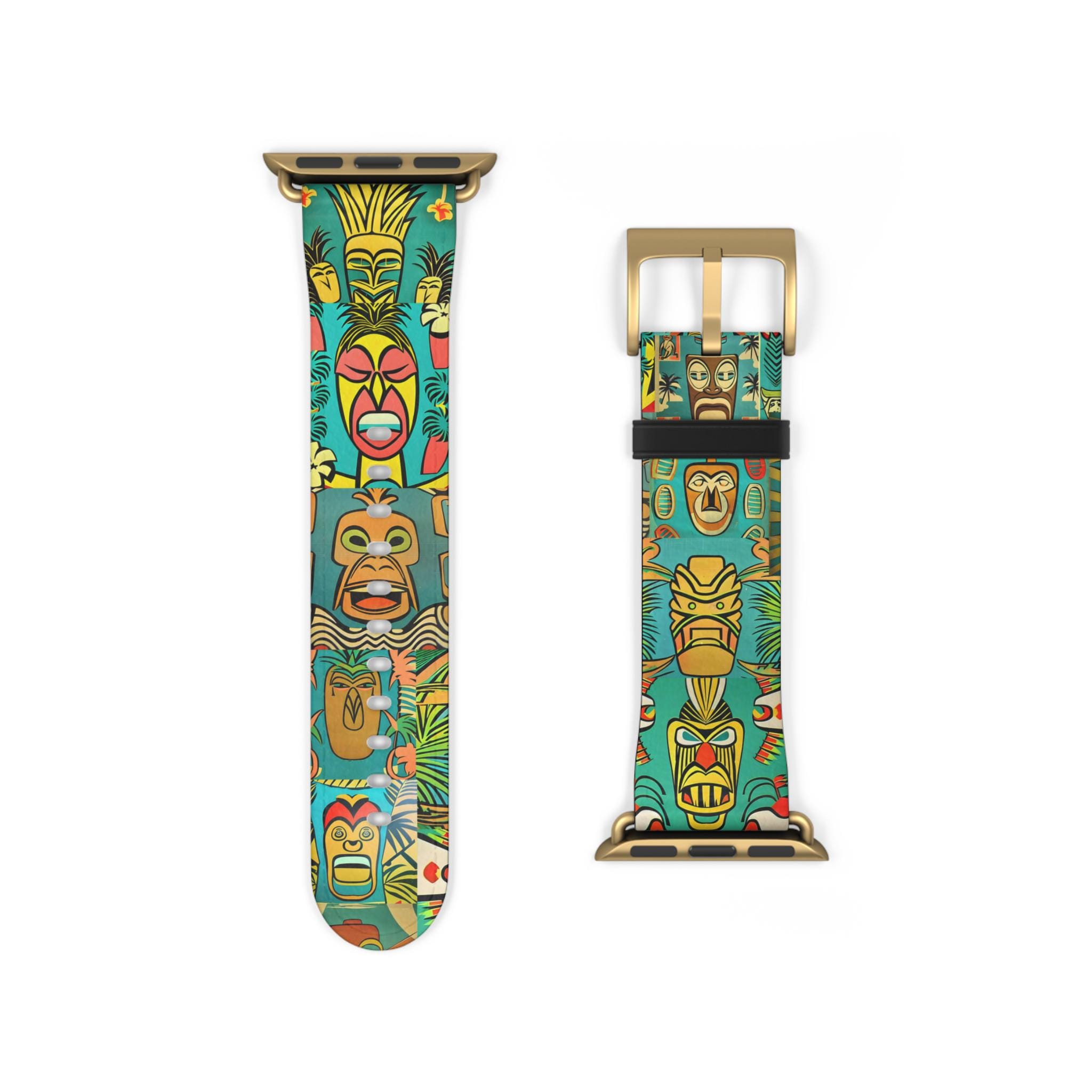 Colorful Tropical MCM Polynesian inspired Watch Band featuring a Tiki Mask pattern. This vibrant strap is perfect for adding a touch of tropical paradise to your Apple Watch. Ideal for adults who love colorful and unique accessories. Perfect for summer, vacations, beach trips, or just adding a pop of color to your everyday wardrobe.