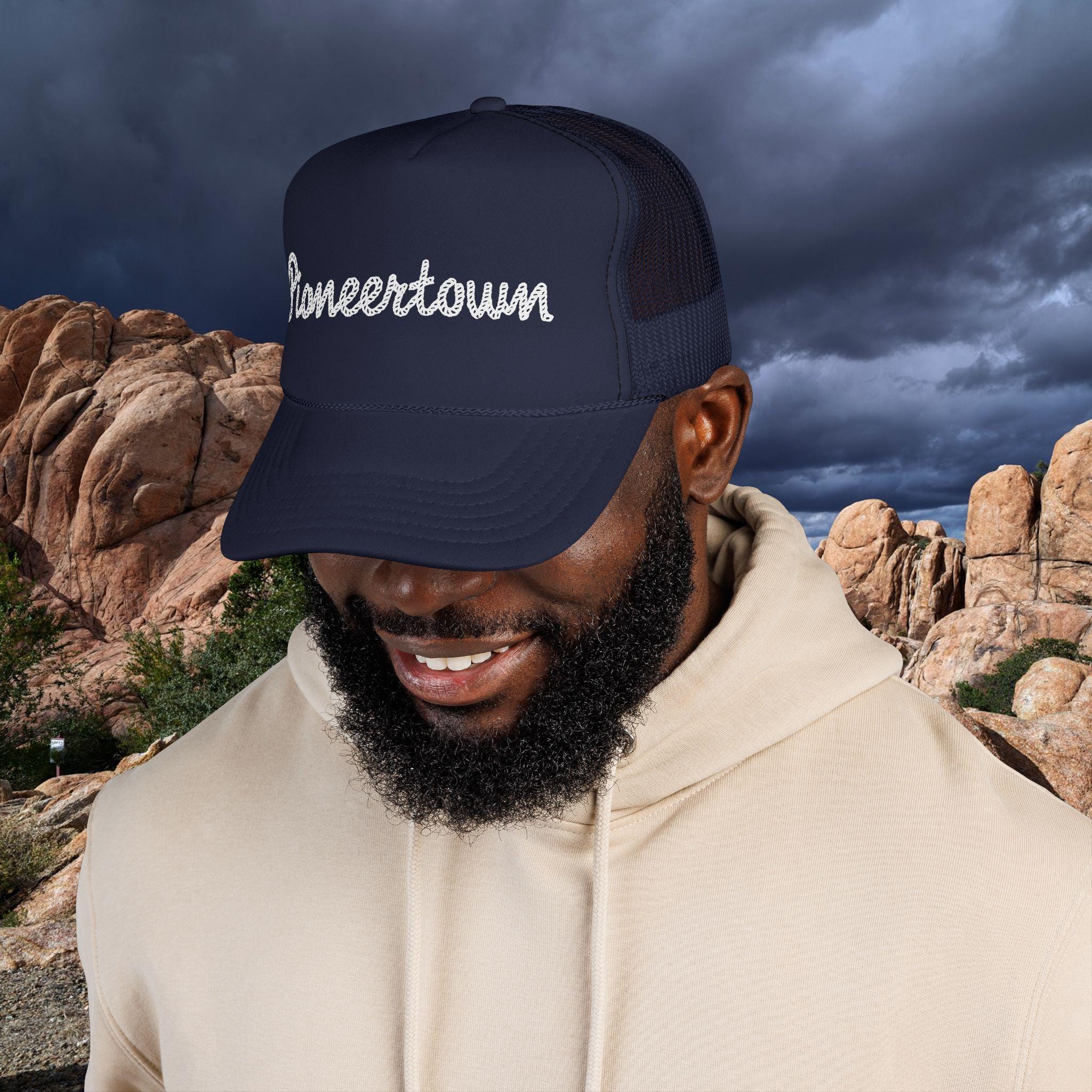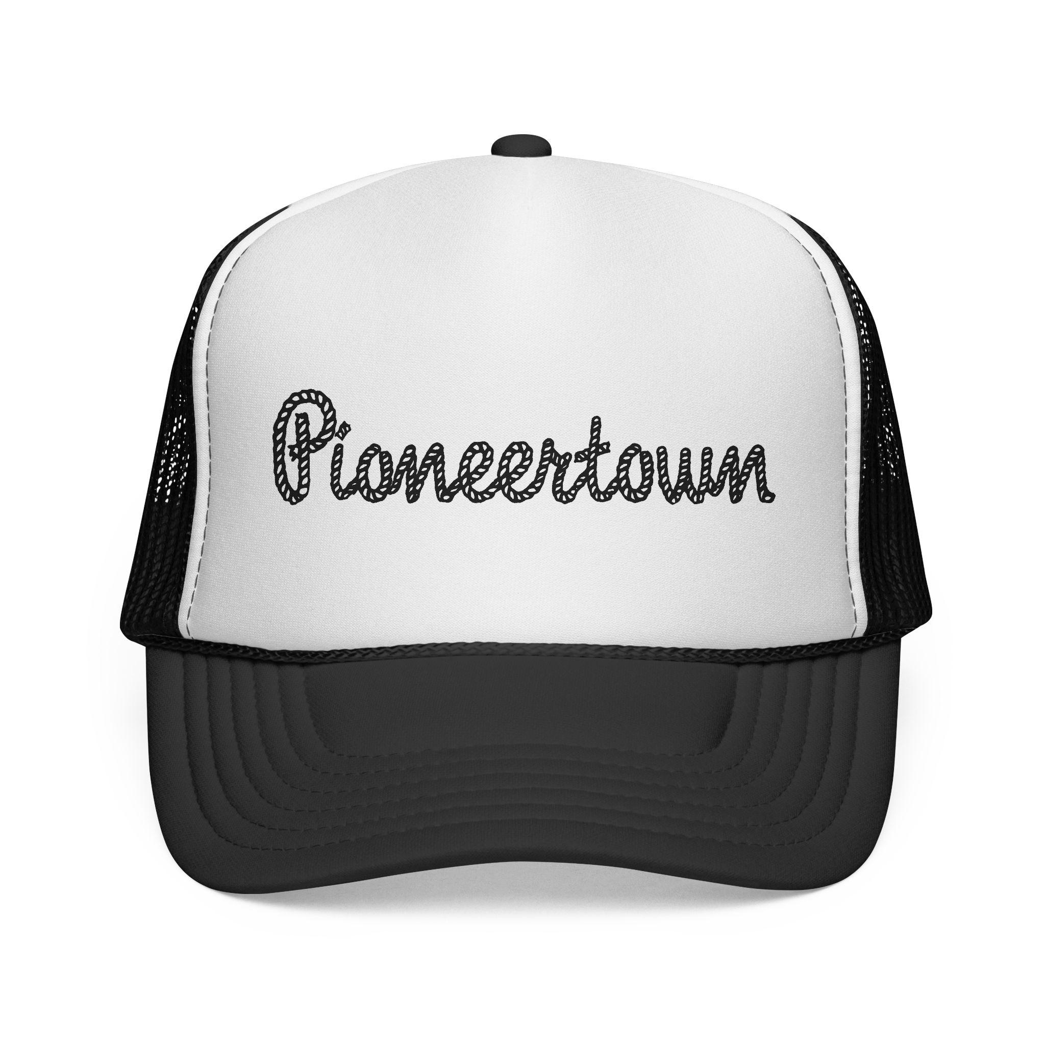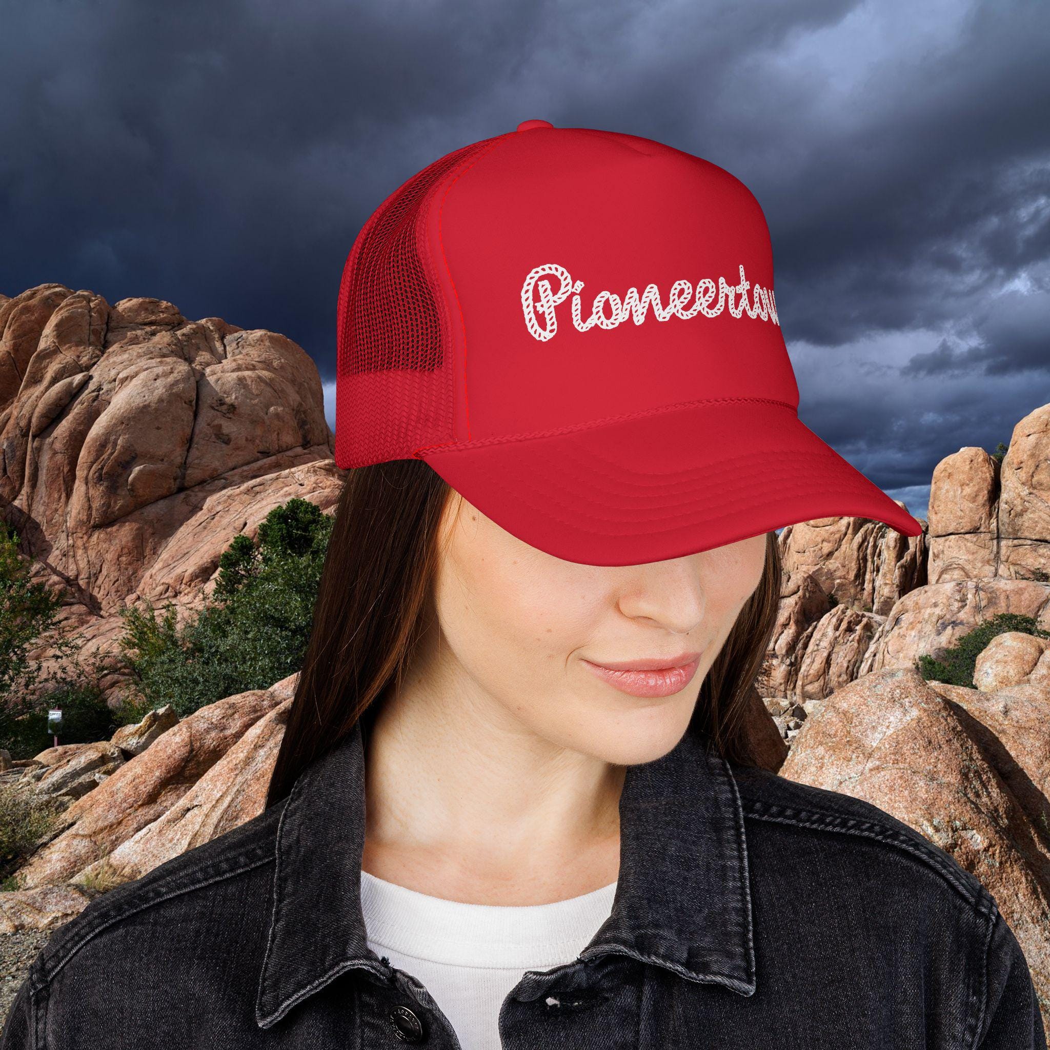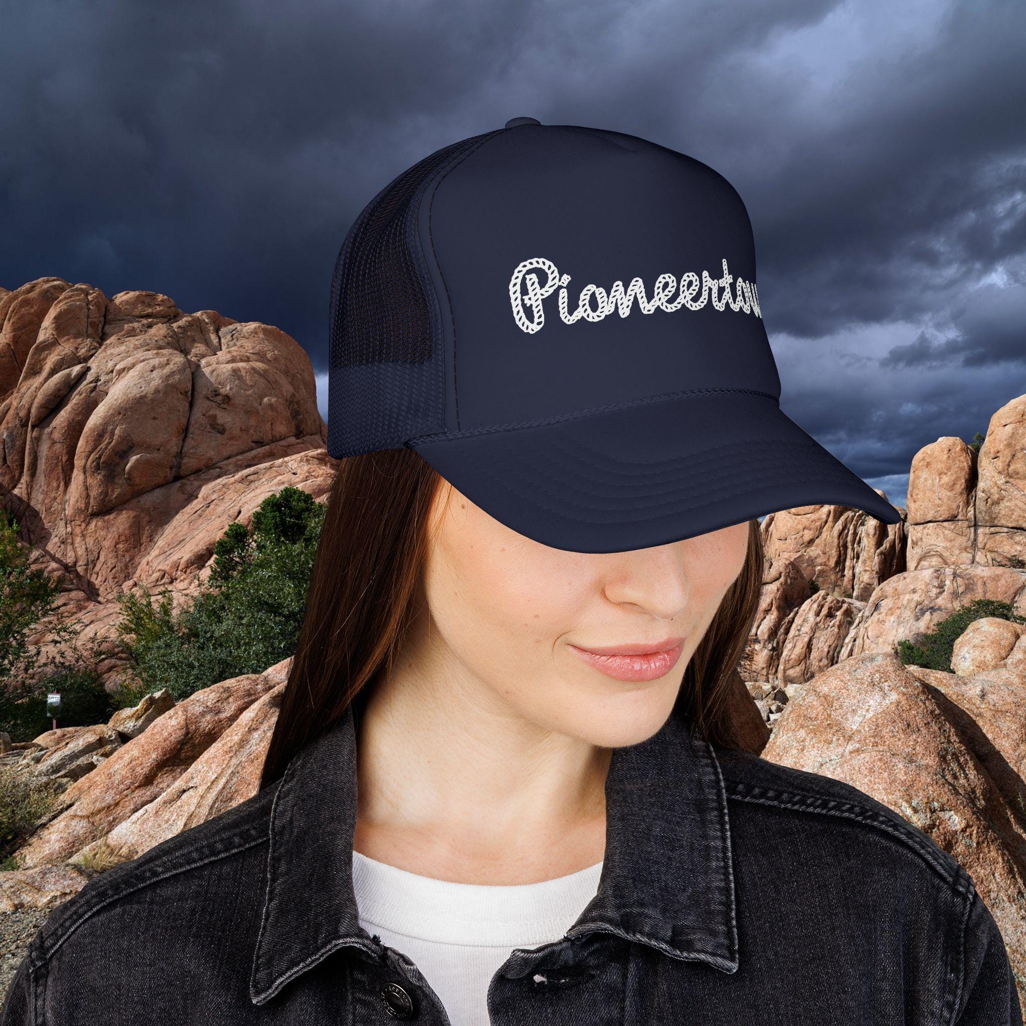 Pioneertown trucker cap with rope script logo, giving off a cool High Desert CA vibe. Perfect for adults looking for a stylish and comfortable baseball hat. Ideal for outdoor activities, road trips, and casual wear. Great for gifting on birthdays, vacations, and music festivals.