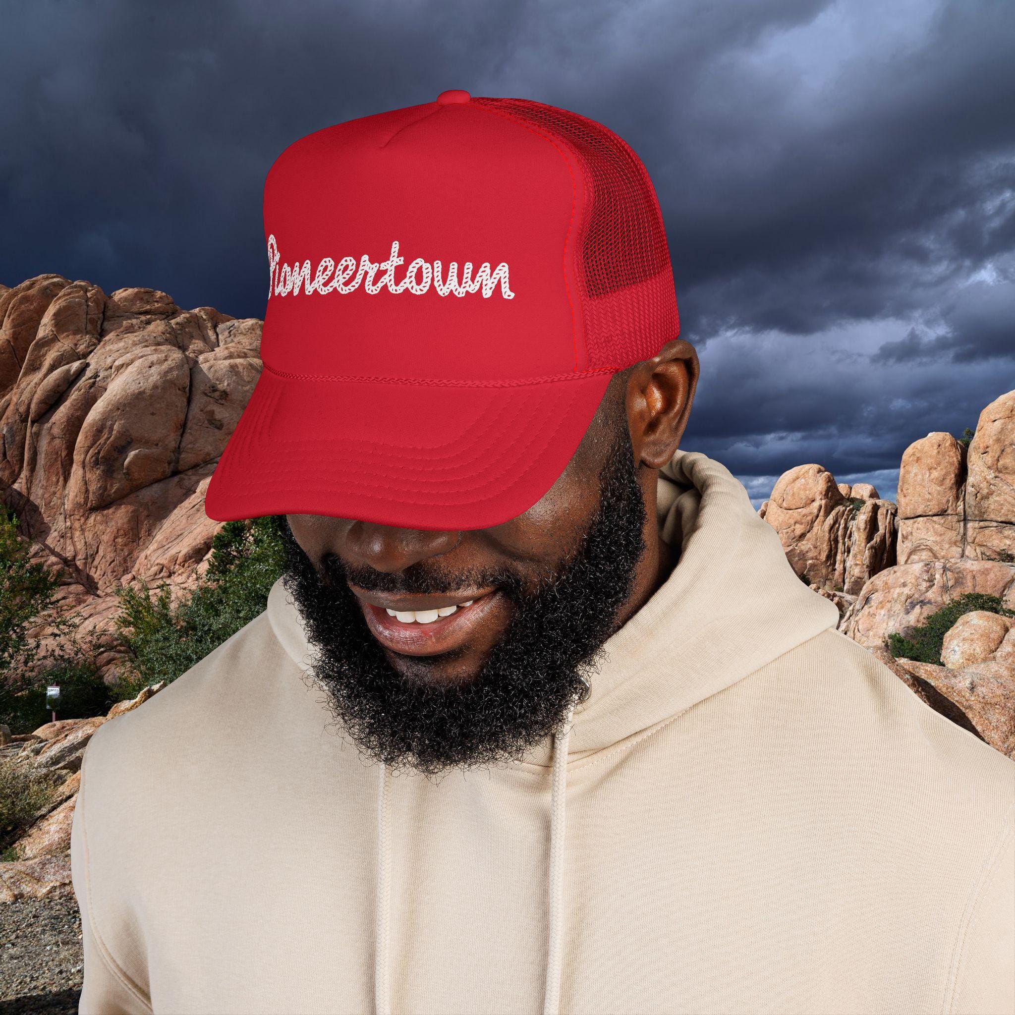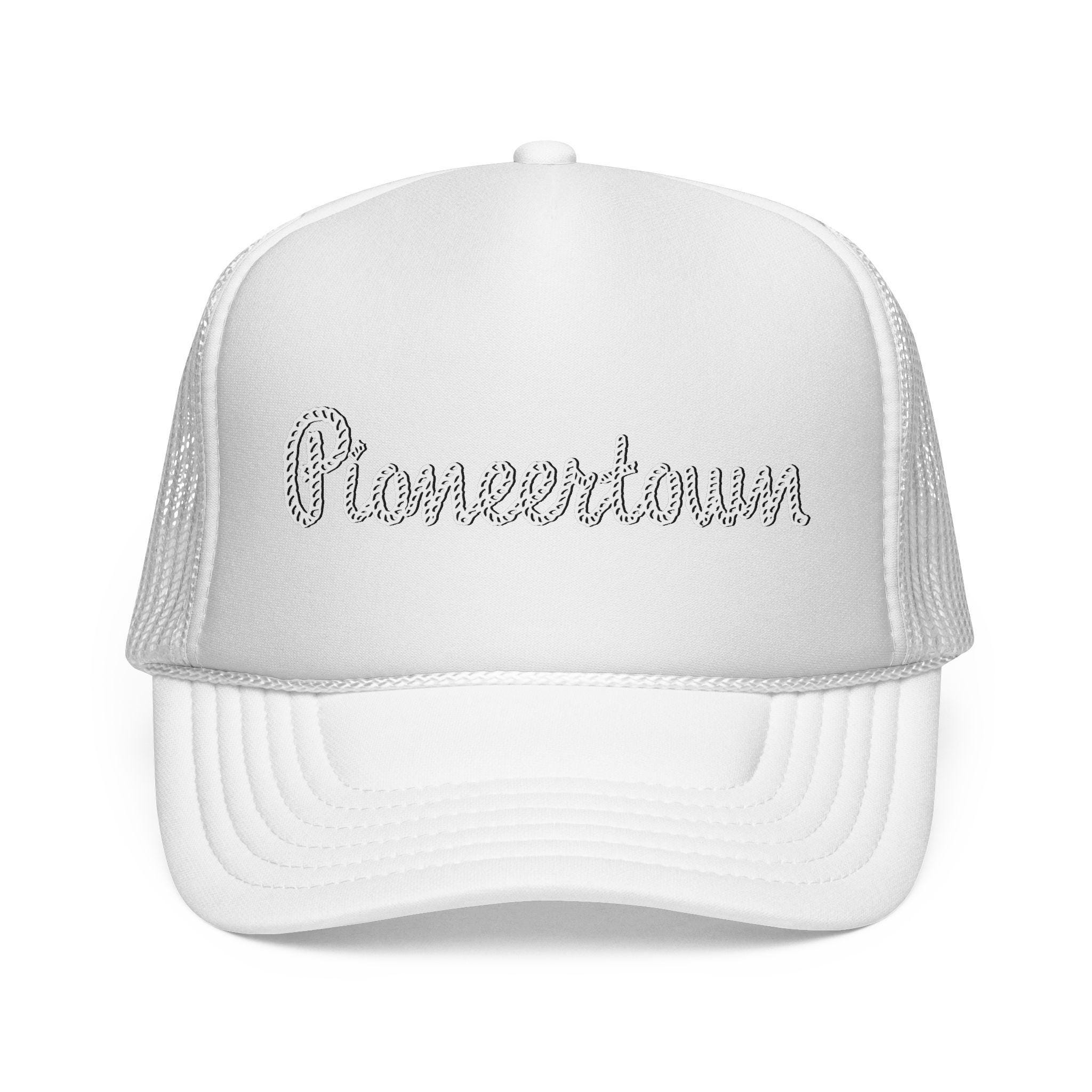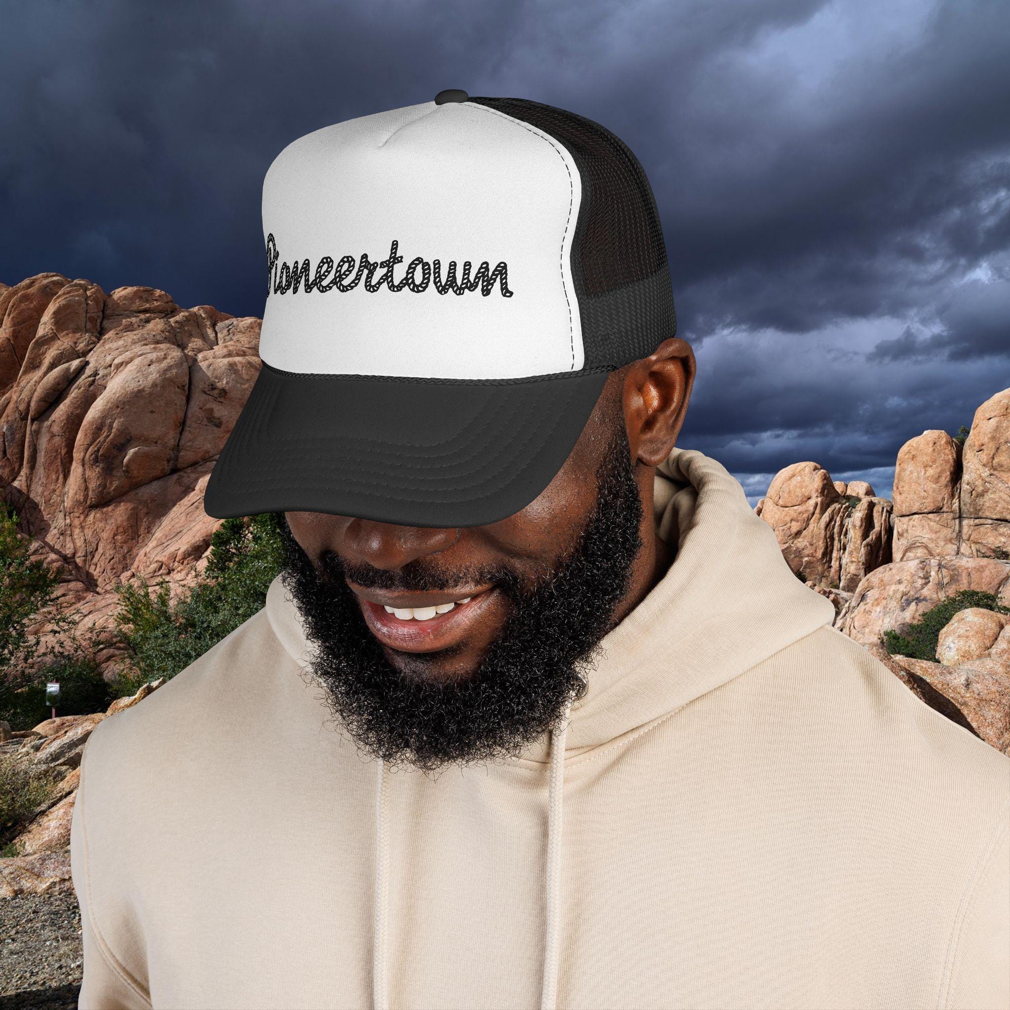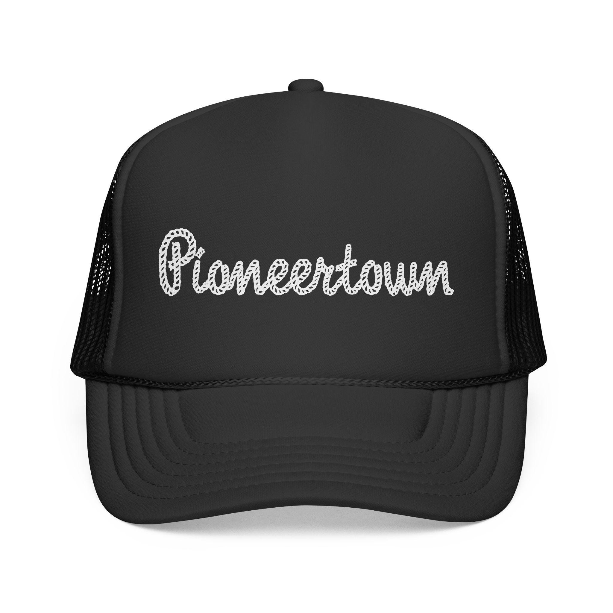 Pioneertown trucker cap with rope script logo, giving off a cool High Desert CA vibe. Perfect for adults looking for a stylish and comfortable baseball hat. Ideal for outdoor activities, road trips, and casual wear. Great for gifting on birthdays, vacations, and music festivals.