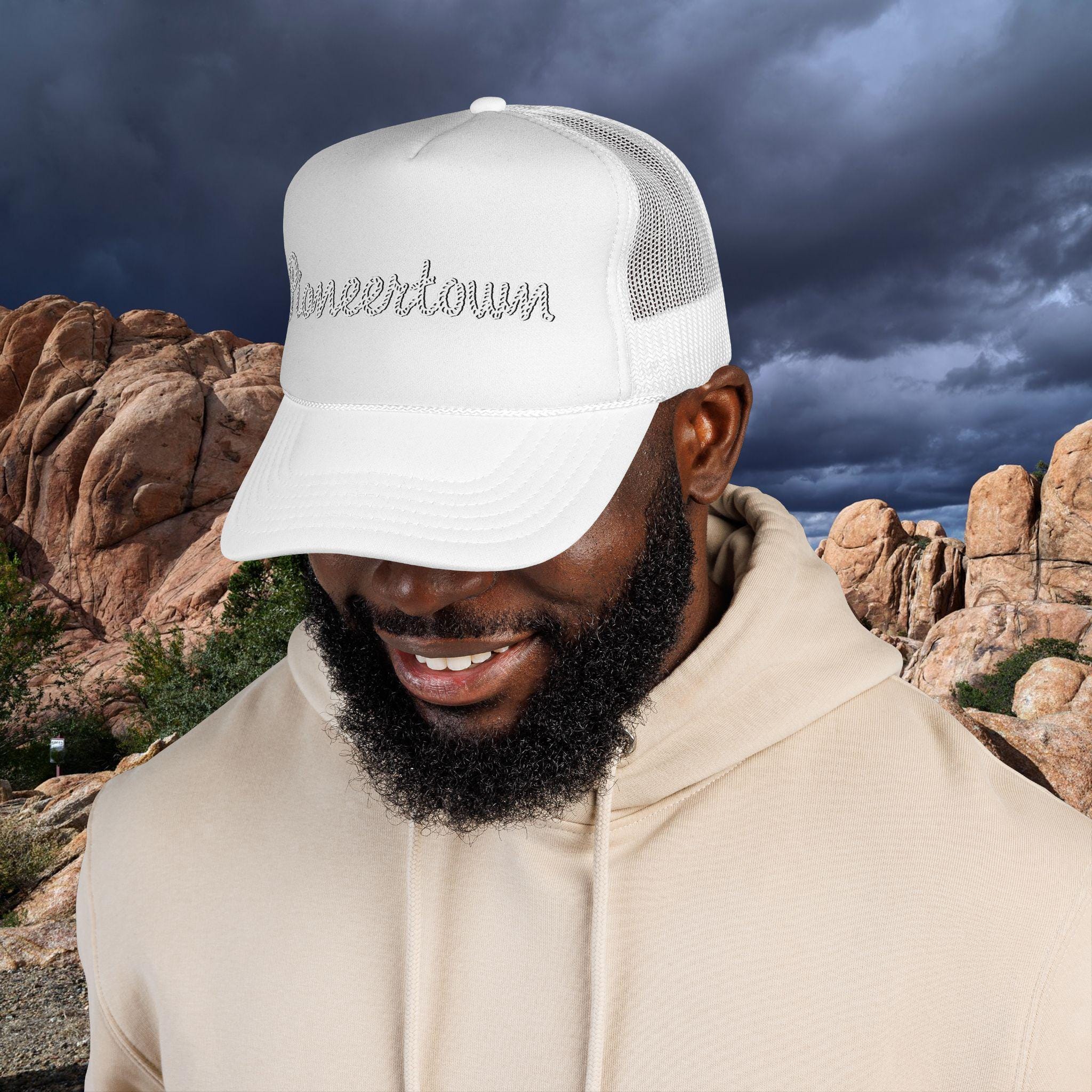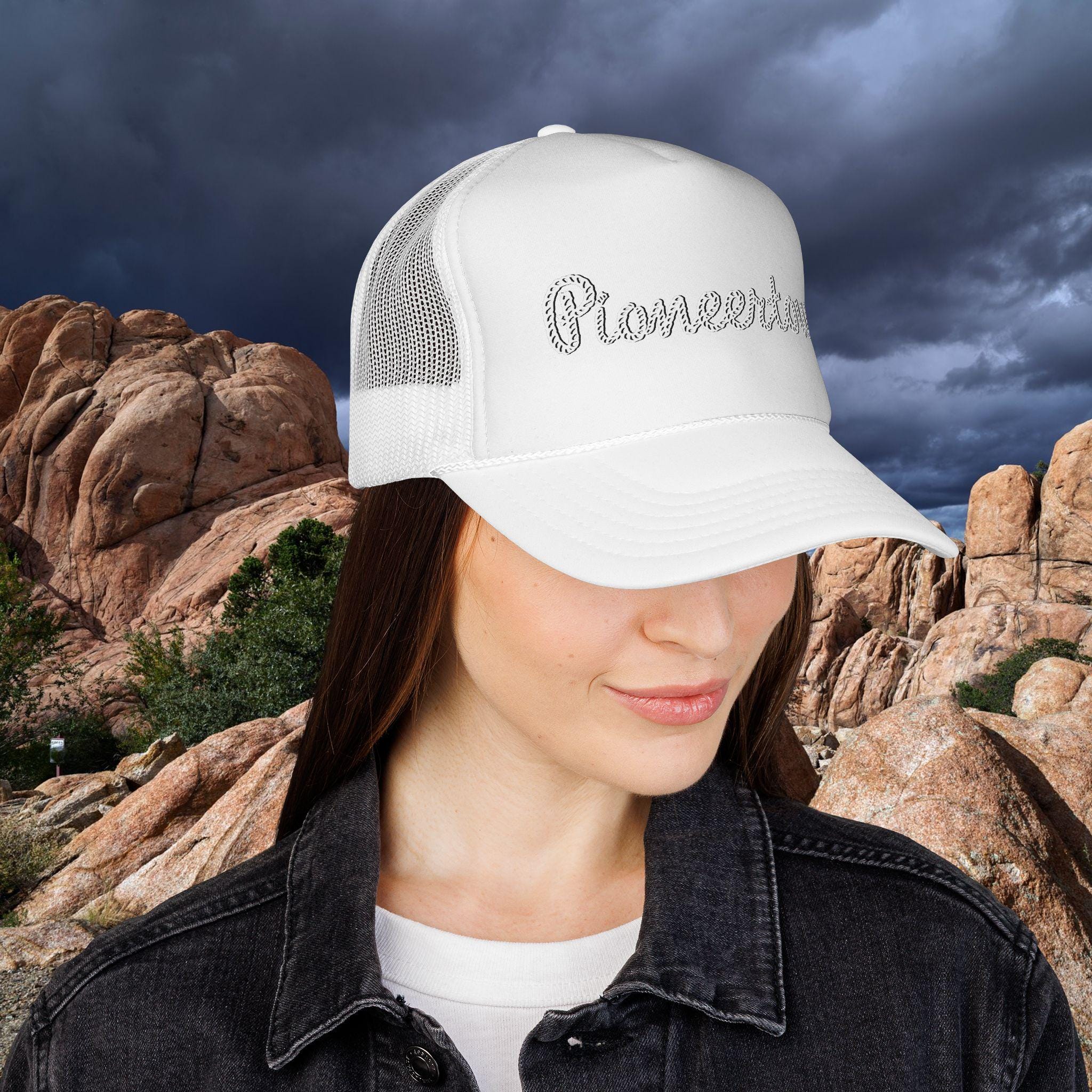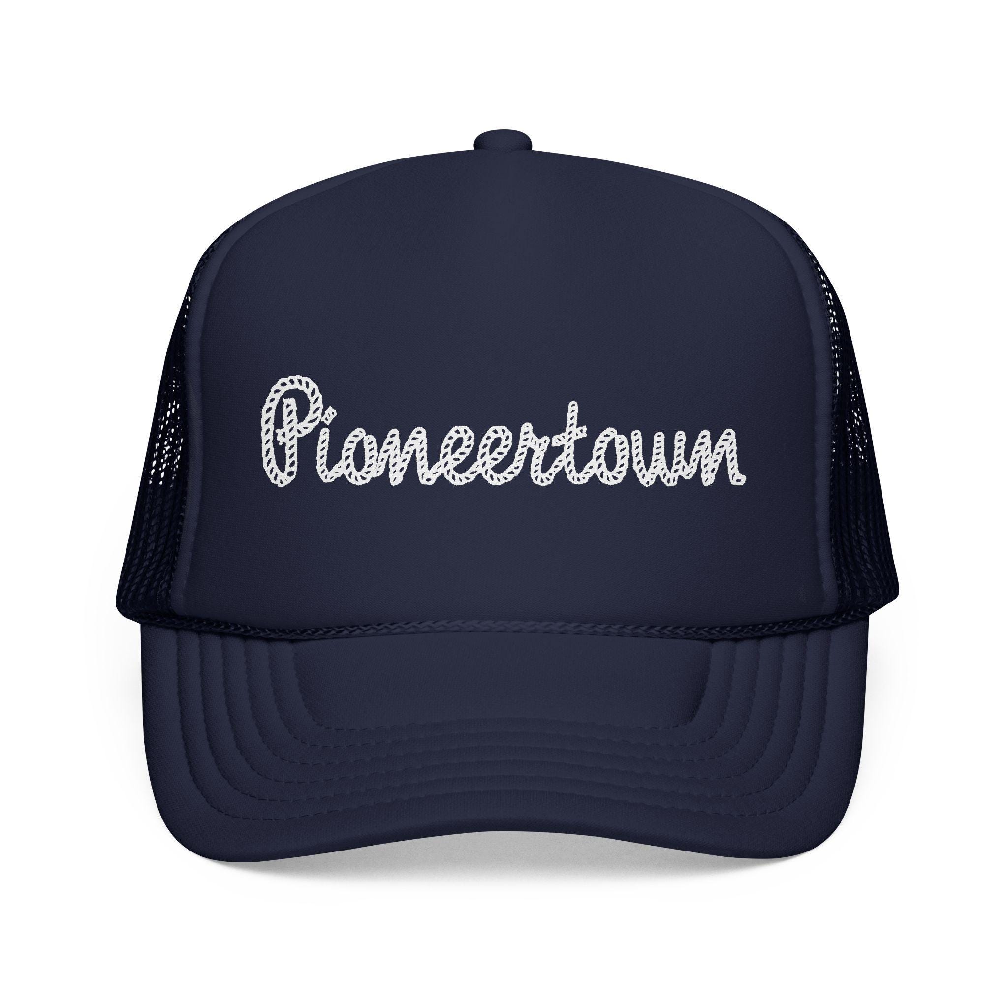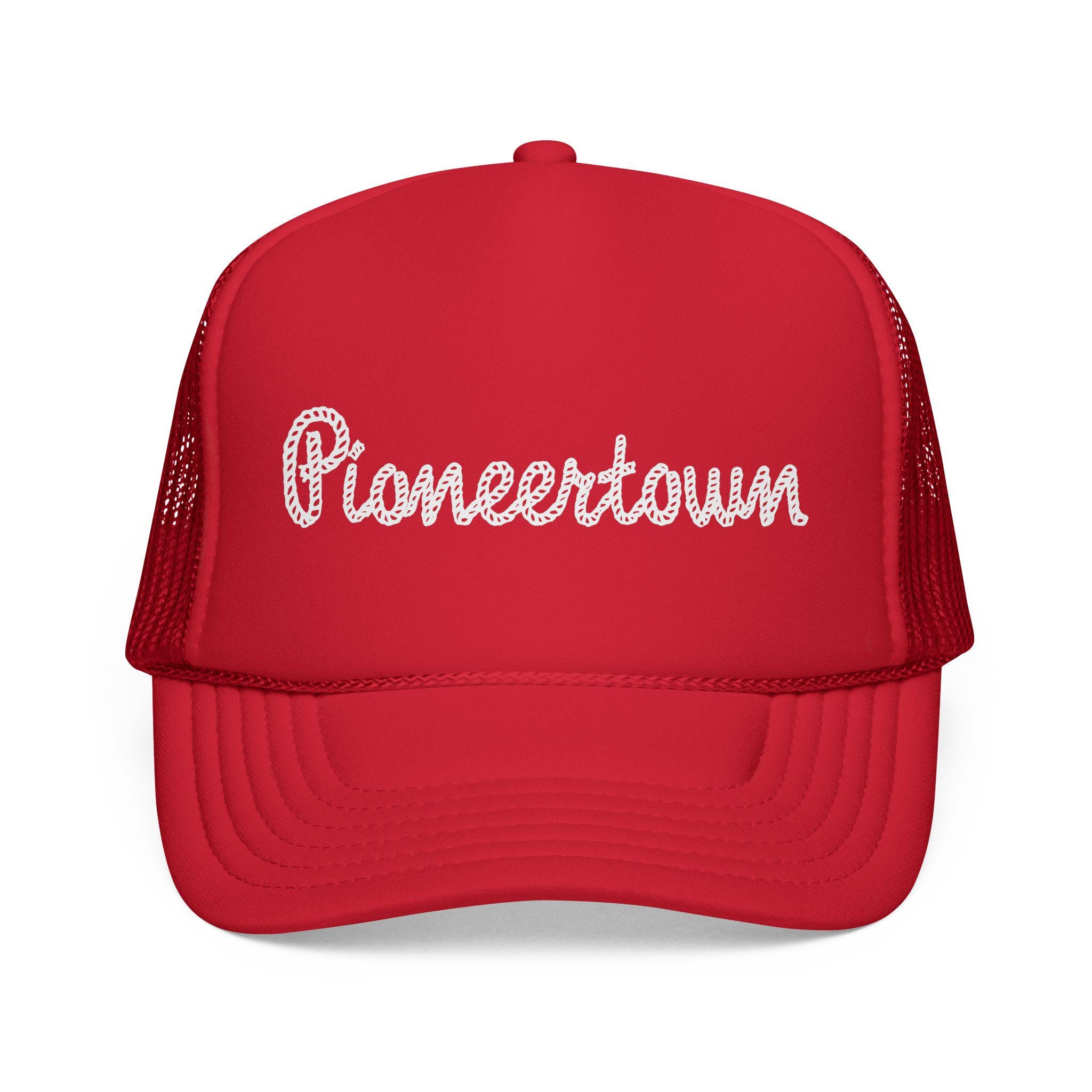 Pioneertown trucker cap with rope script logo, giving off a cool High Desert CA vibe. Perfect for adults looking for a stylish and comfortable baseball hat. Ideal for outdoor activities, road trips, and casual wear. Great for gifting on birthdays, vacations, and music festivals.