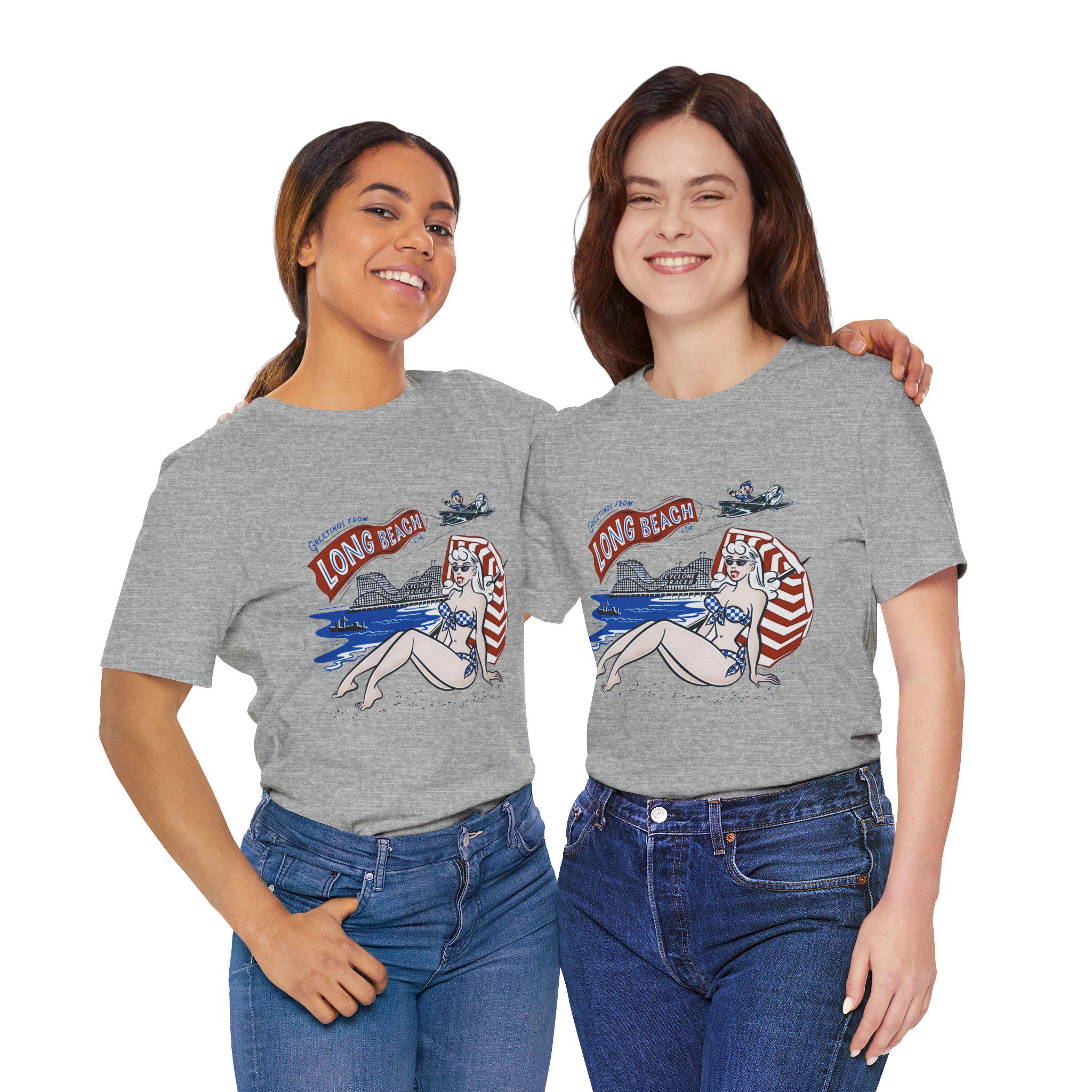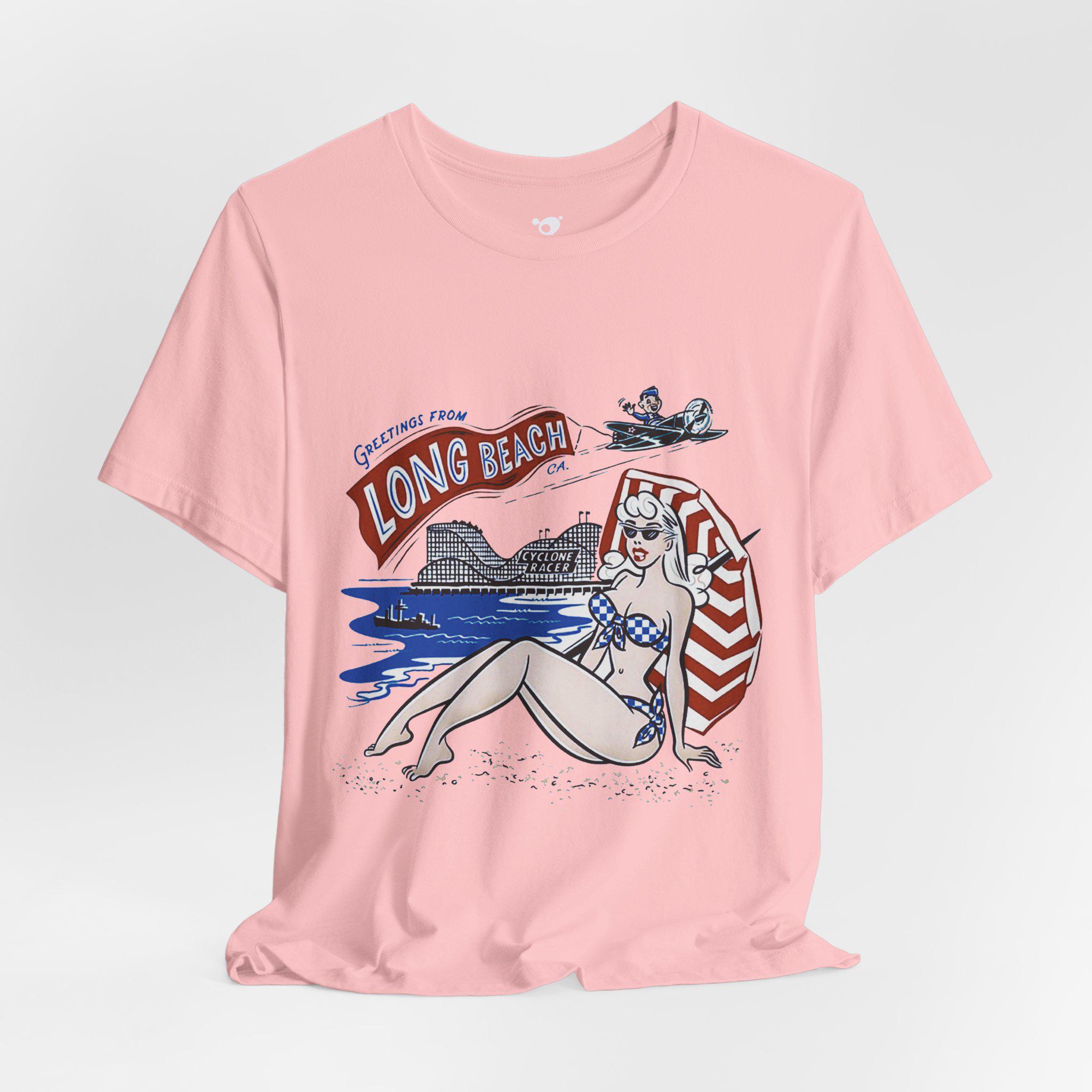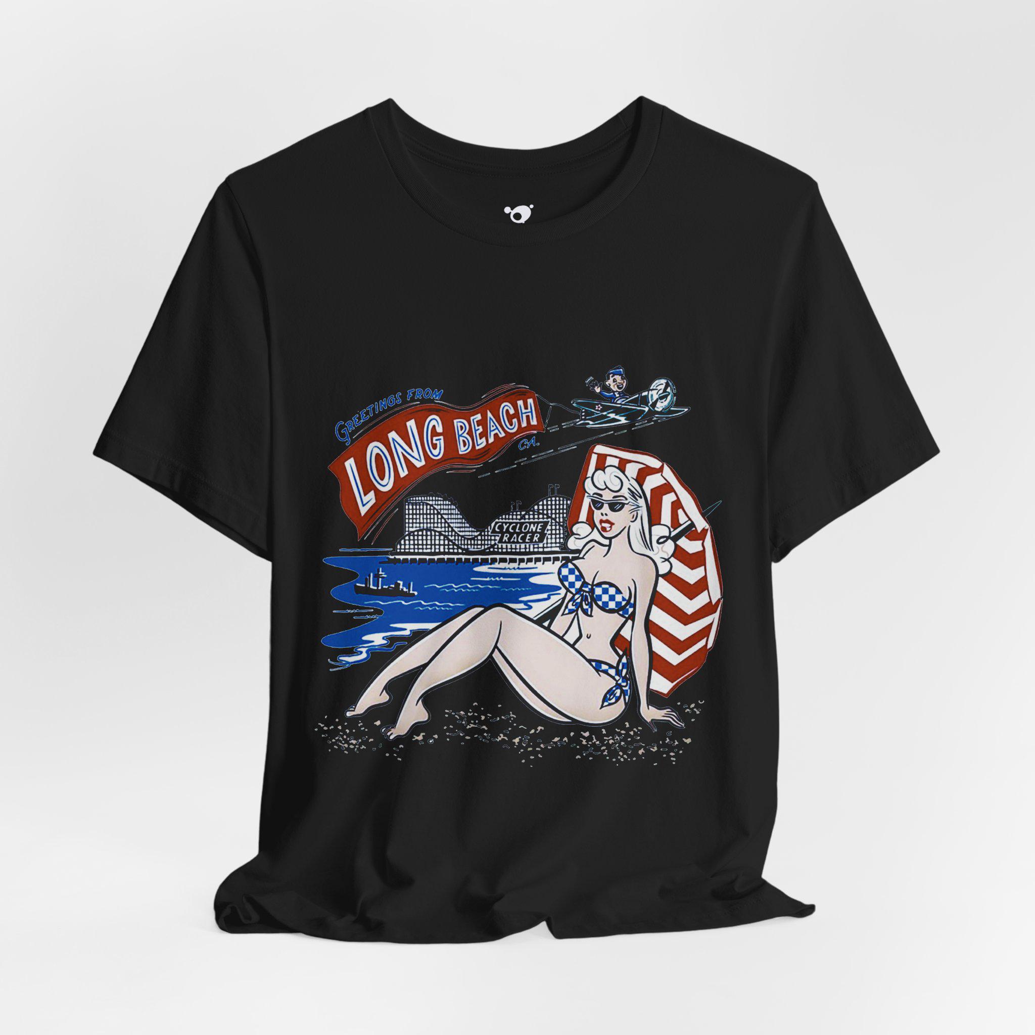 Salt-worn sunlight, a slow ocean breeze, and the hum of a boardwalk carousel — this tee carries that Long Beach afternoon with it. The vintage seaside graphic reads like a postcard from a relaxed California vacation: sun-bleached colors, retro lettering, and a laid-back silhouette that slips into weekend rituals. Lightweight and breathable, it layers easily under a denim jacket or wears alone while exploring coastal streets, grabbing tacos, or meeting friends for a bonfire by the pier. It feels lived-in from the first wear and keeps its shape through repeat adventures, so the memory of that shore-side evening stays with you.