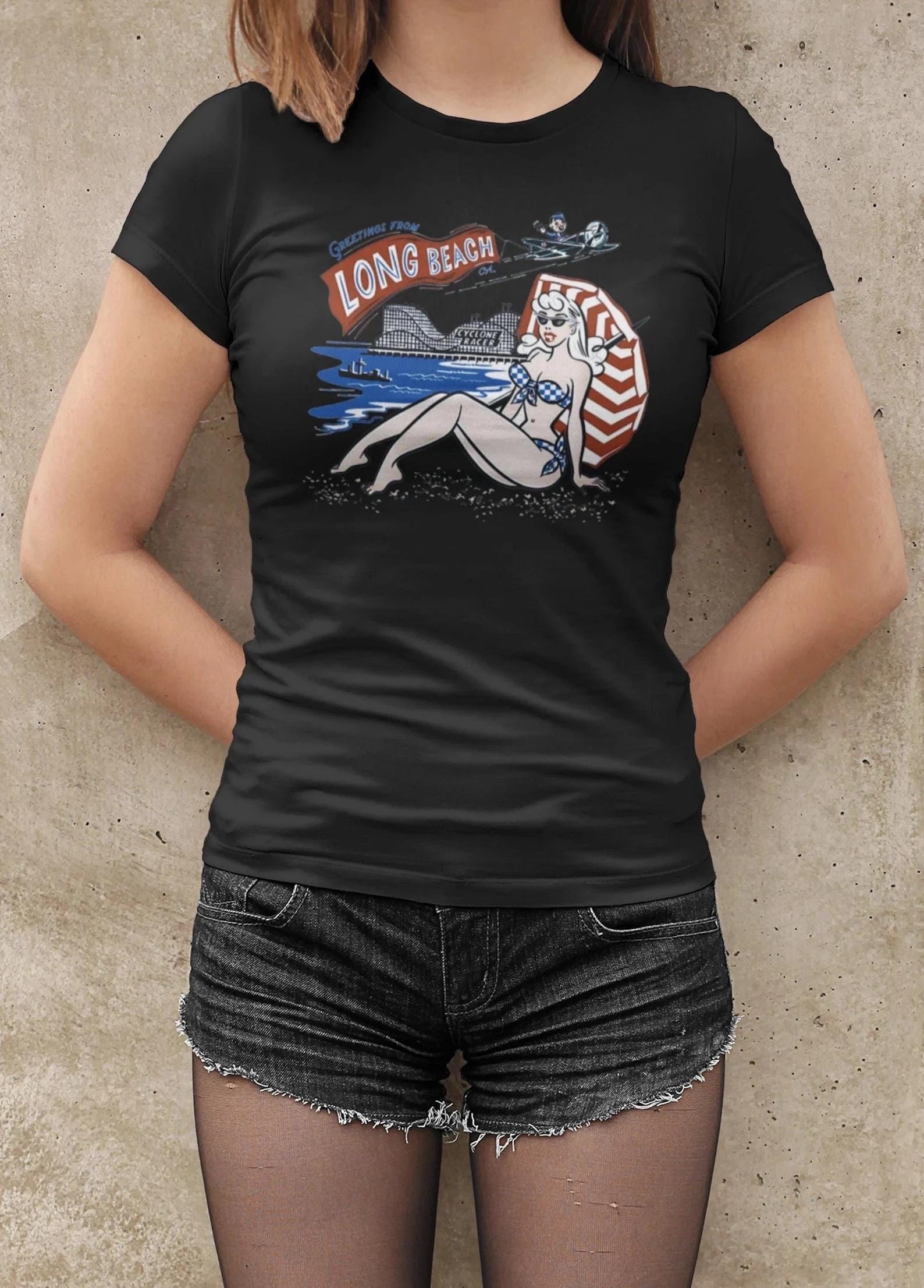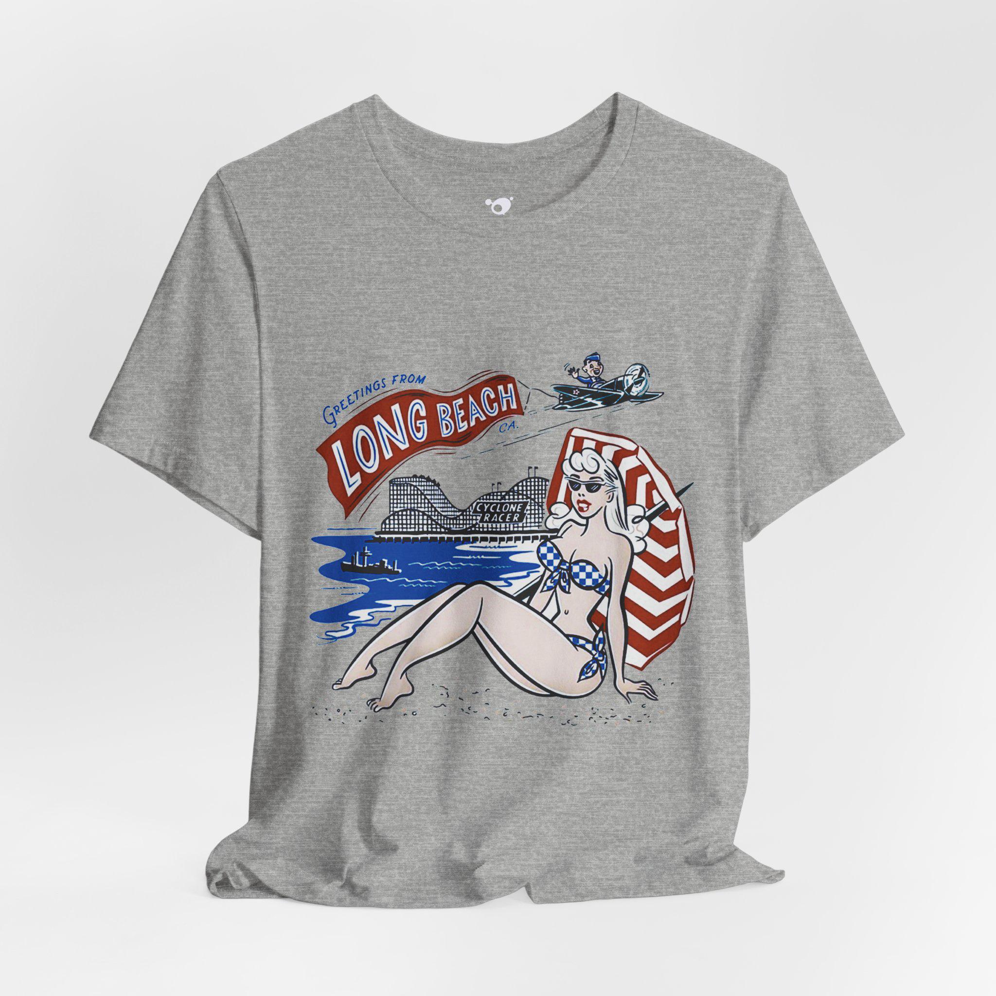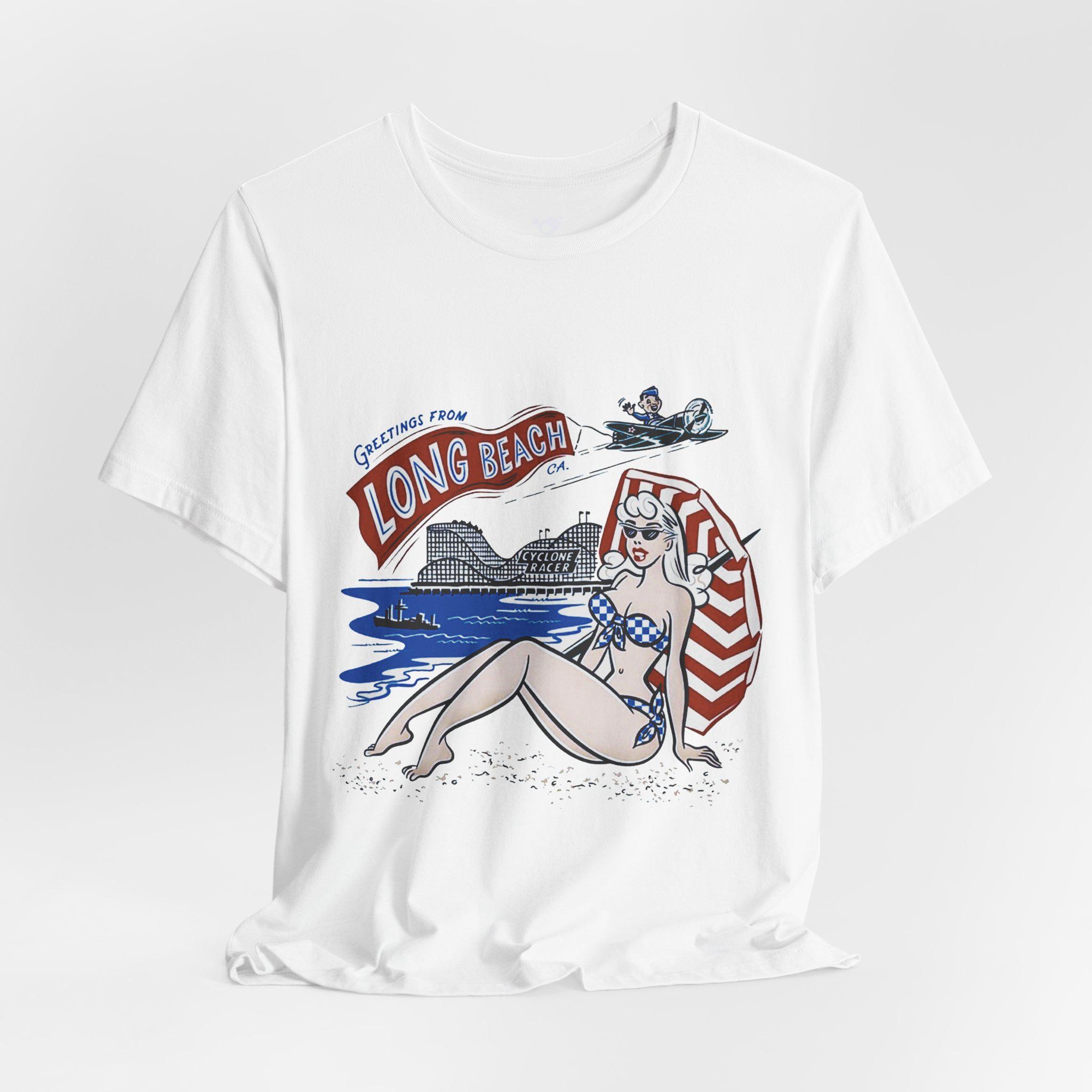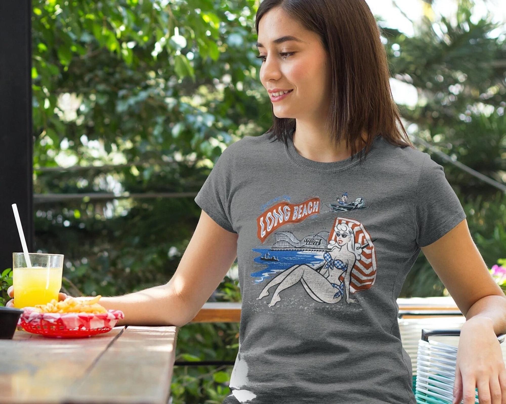 Salt-worn sunlight, a slow ocean breeze, and the hum of a boardwalk carousel — this tee carries that Long Beach afternoon with it. The vintage seaside graphic reads like a postcard from a relaxed California vacation: sun-bleached colors, retro lettering, and a laid-back silhouette that slips into weekend rituals. Lightweight and breathable, it layers easily under a denim jacket or wears alone while exploring coastal streets, grabbing tacos, or meeting friends for a bonfire by the pier. It feels lived-in from the first wear and keeps its shape through repeat adventures, so the memory of that shore-side evening stays with you.