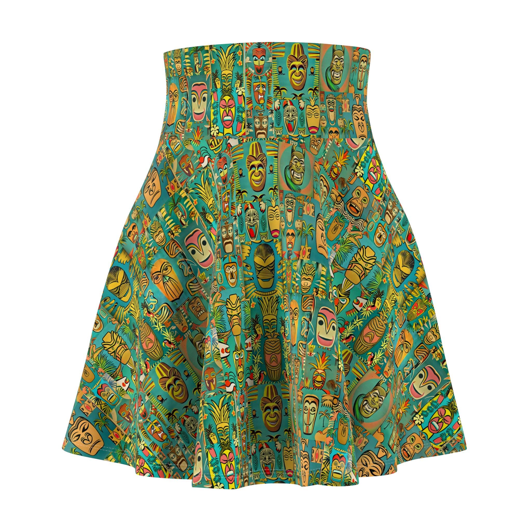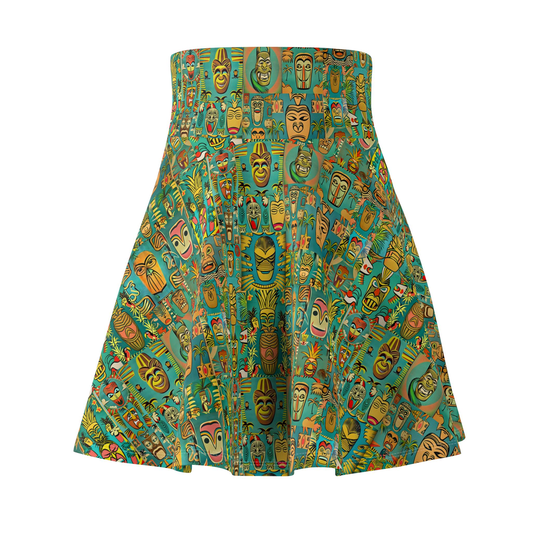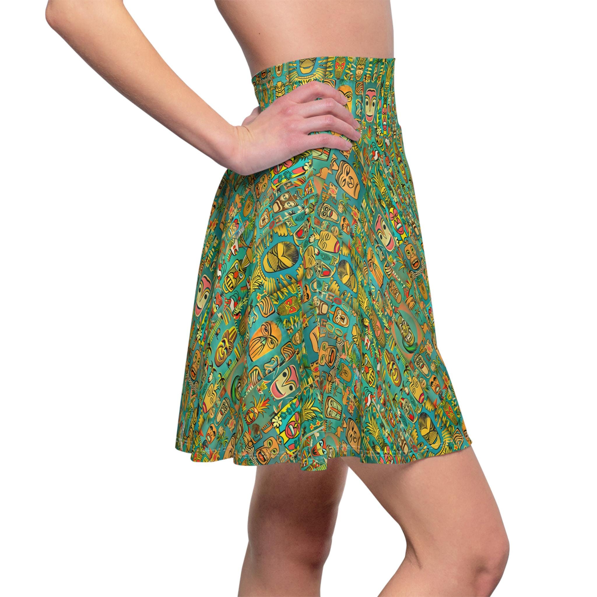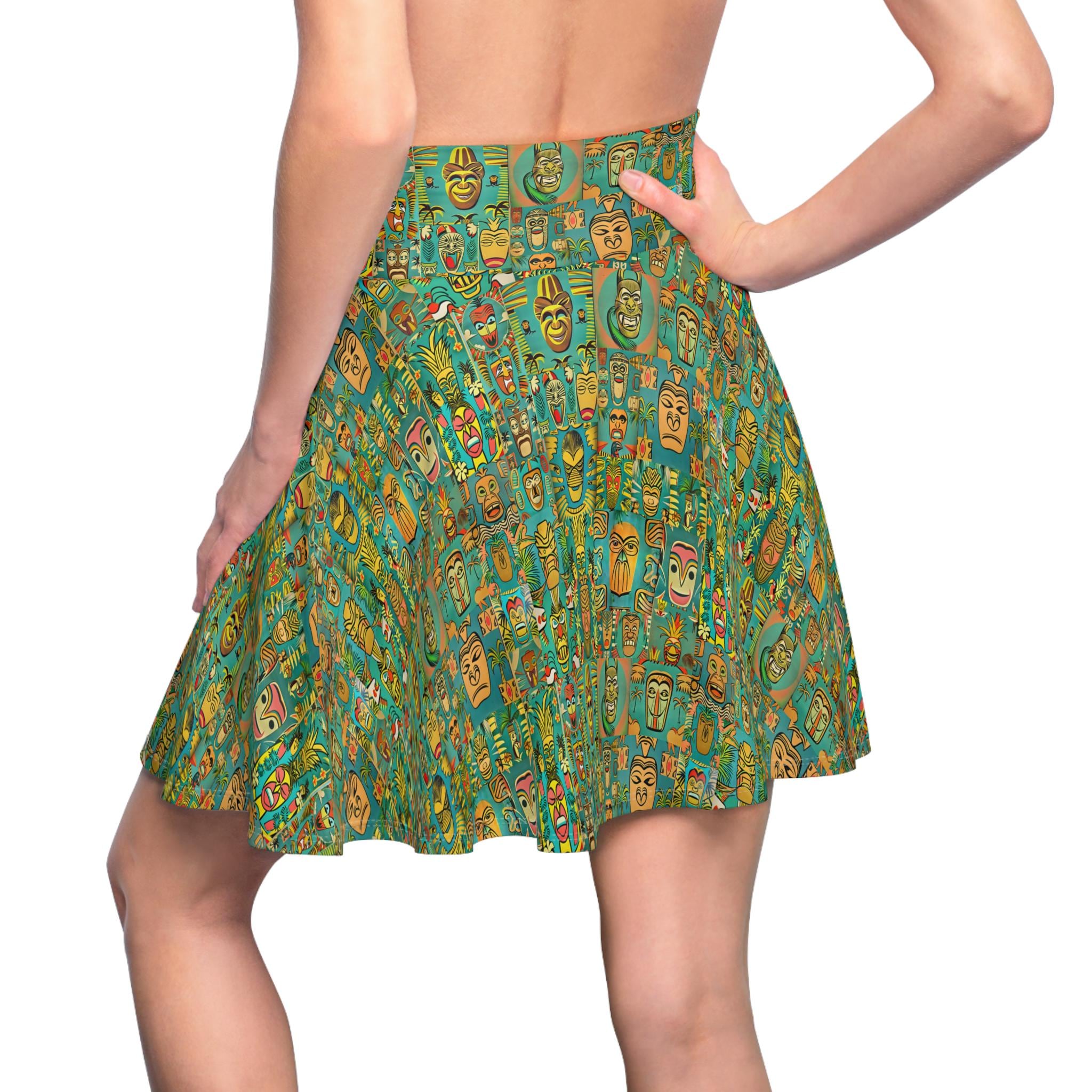 Channeling mid-century island evenings, this skater skirt brings a retro tiki vibe into everyday wear. Lightweight with a lively green pattern, it sways with your steps and recalls warm breezes, rattan lamps, and split-second escapes to seaside cocktail bars. The high-rise double waistband sits confidently at the waist, while the full, flared silhouette moves freely—great for dancing at a backyard tiki night or strolling city streets with a vintage tote. The fabric’s smooth stretch keeps the print crisp and the fit forgiving, so the skirt looks lively whether you’re layering a cropped knit for cooler nights or pairing with a breezy tank when the sun is up. It feels like a small, wearable set design that brings retro warmth and playful energy to your wardrobe.