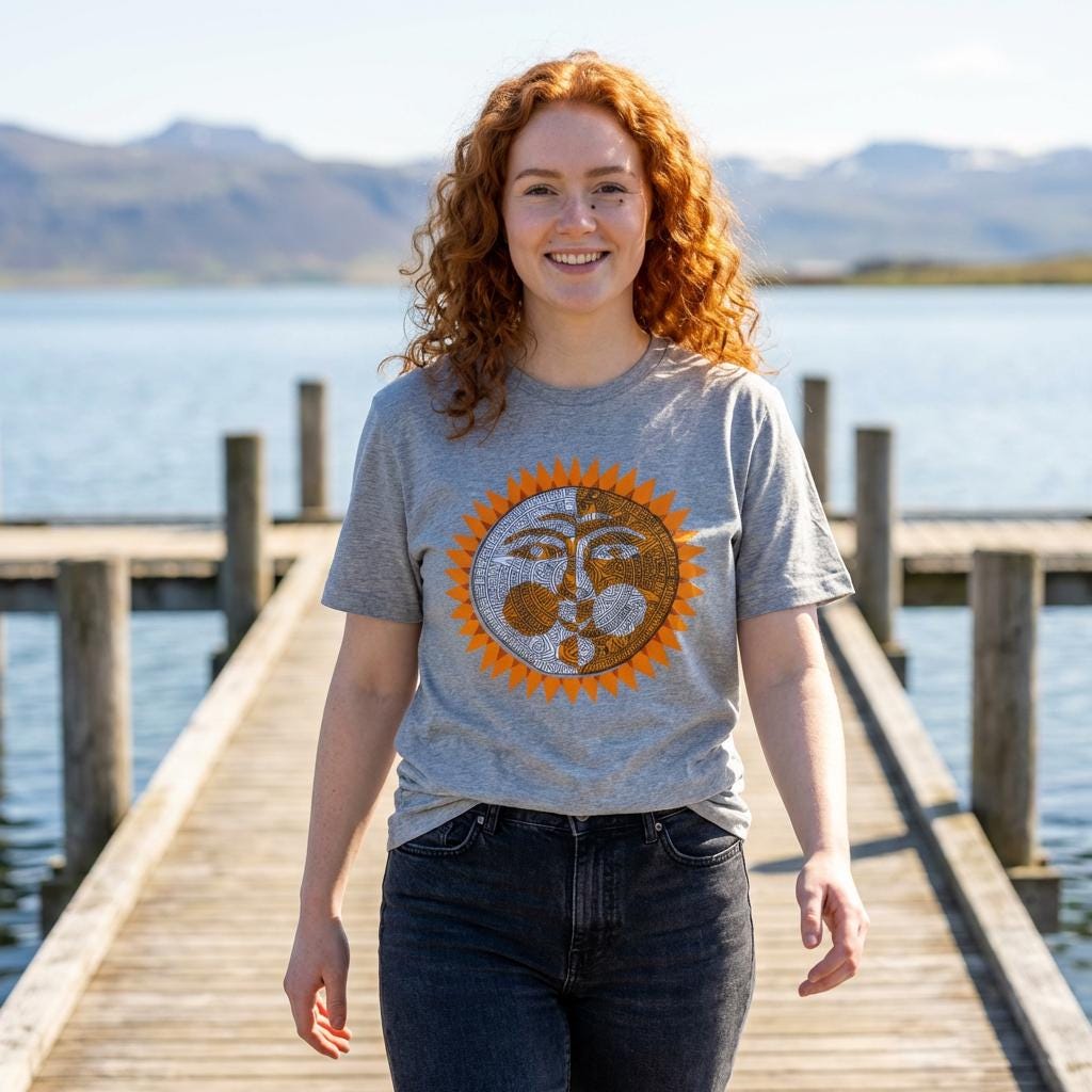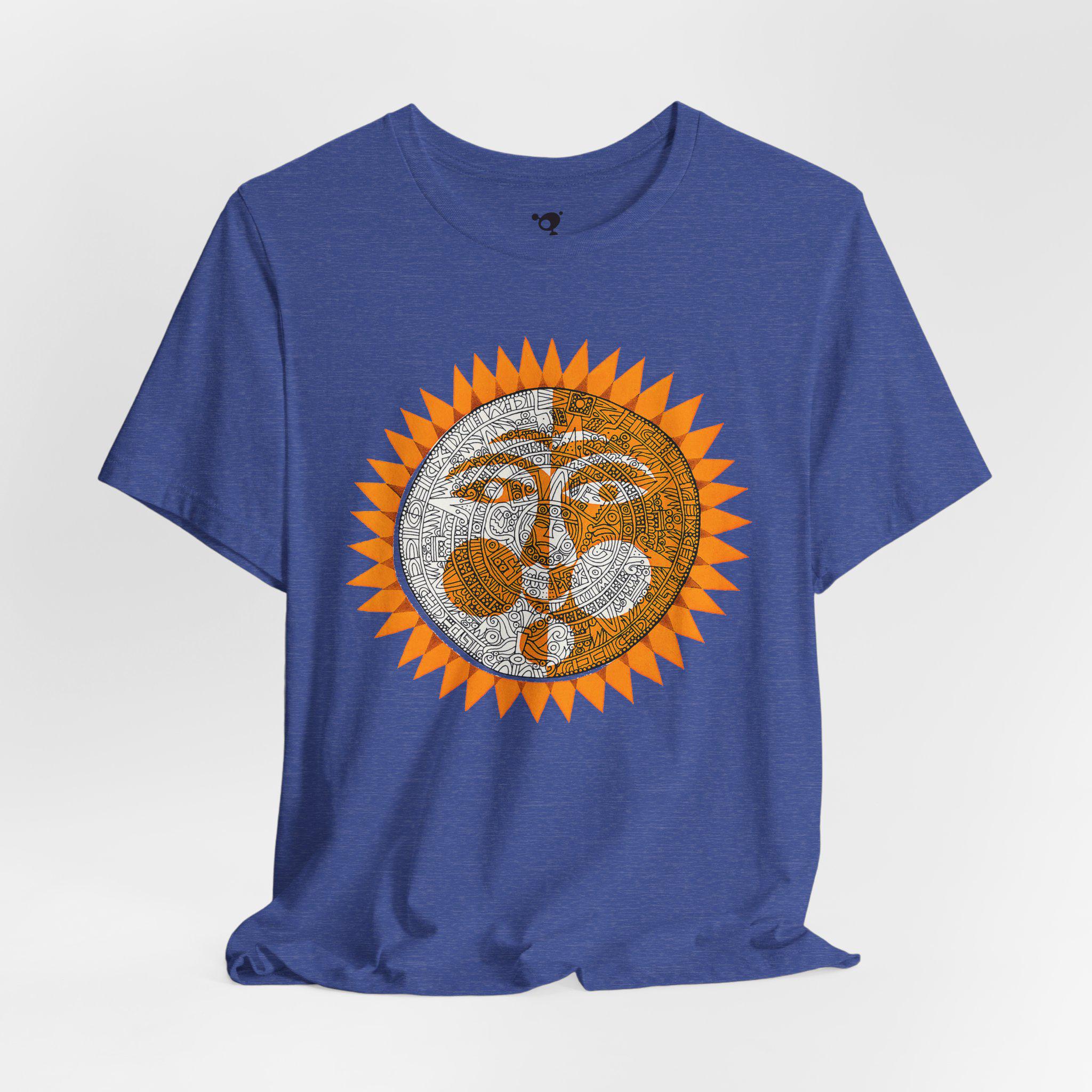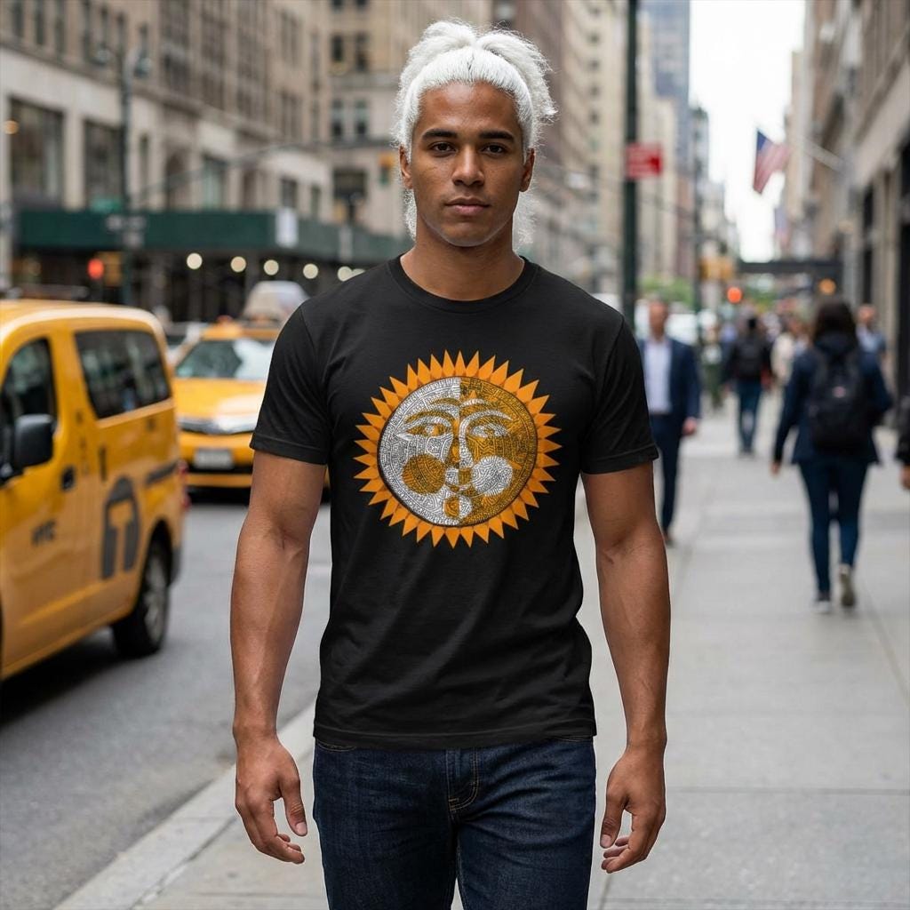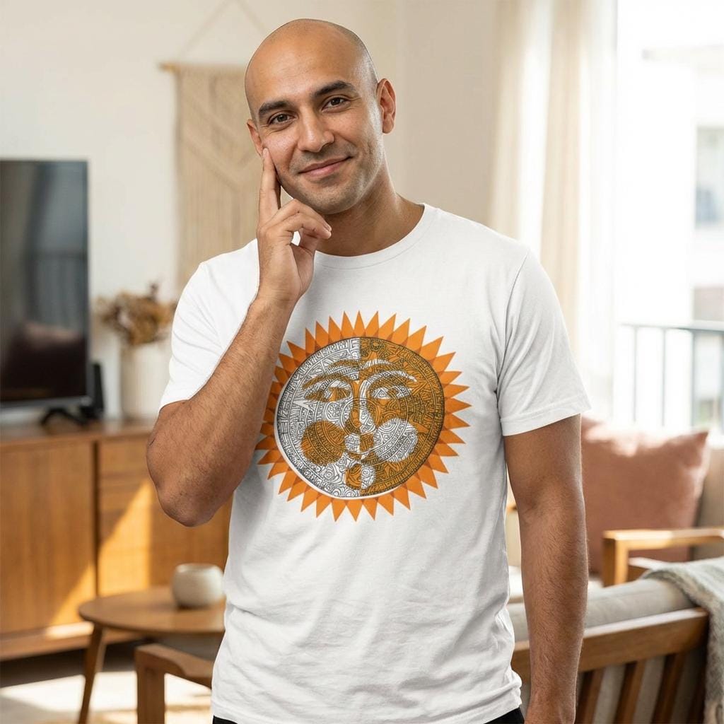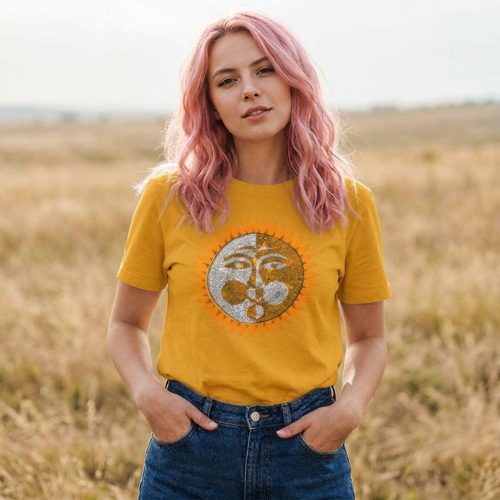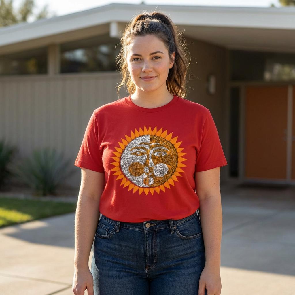 South American Mayan Sun Symbol with a 50's take. This lightweight Bella+Canvas tee brings a sunlit slice of mid-century charm to your everyday wardrobe. The retro sun illustration — rendered in warm, vintage tones and clean geometric lines — sits comfortably on a classic crew tee, evoking slow summer mornings, vinyl records, and the quiet optimism of 1950s design. The breathable Airlume combed and ring-spun cotton feels soft against the skin, while side seams and shoulder tape keep the silhouette tidy through repeated wear. Wear it layered under a denim jacket for market mornings or alone on brighter days to let the sunshine graphic do the talking. Thoughtfully made with tear-away labels and REACH-certified materials, it’s for people who care about comfort, craft, and a lived-in, nostalgic aesthetic.